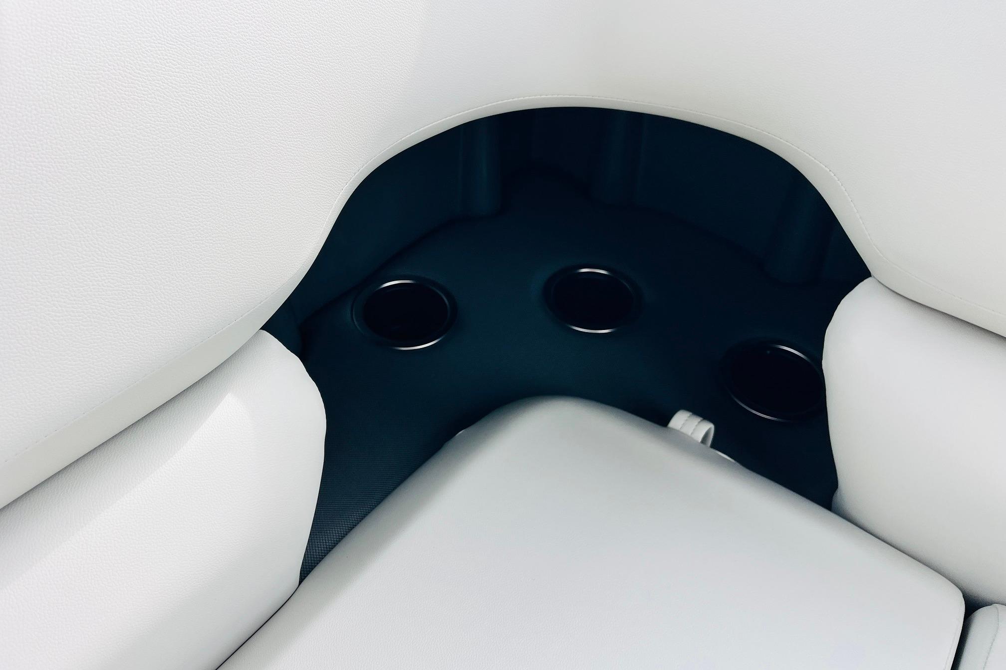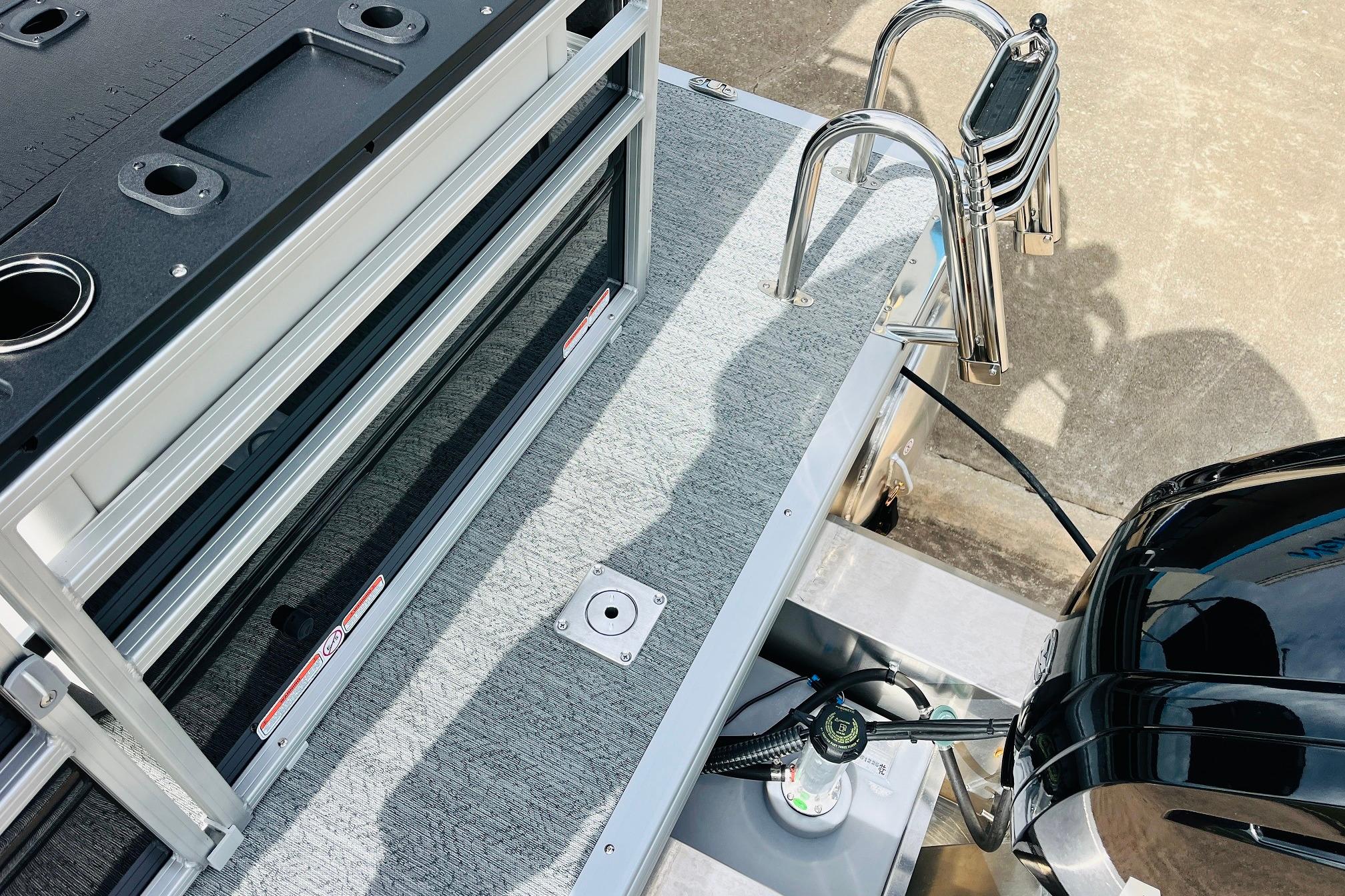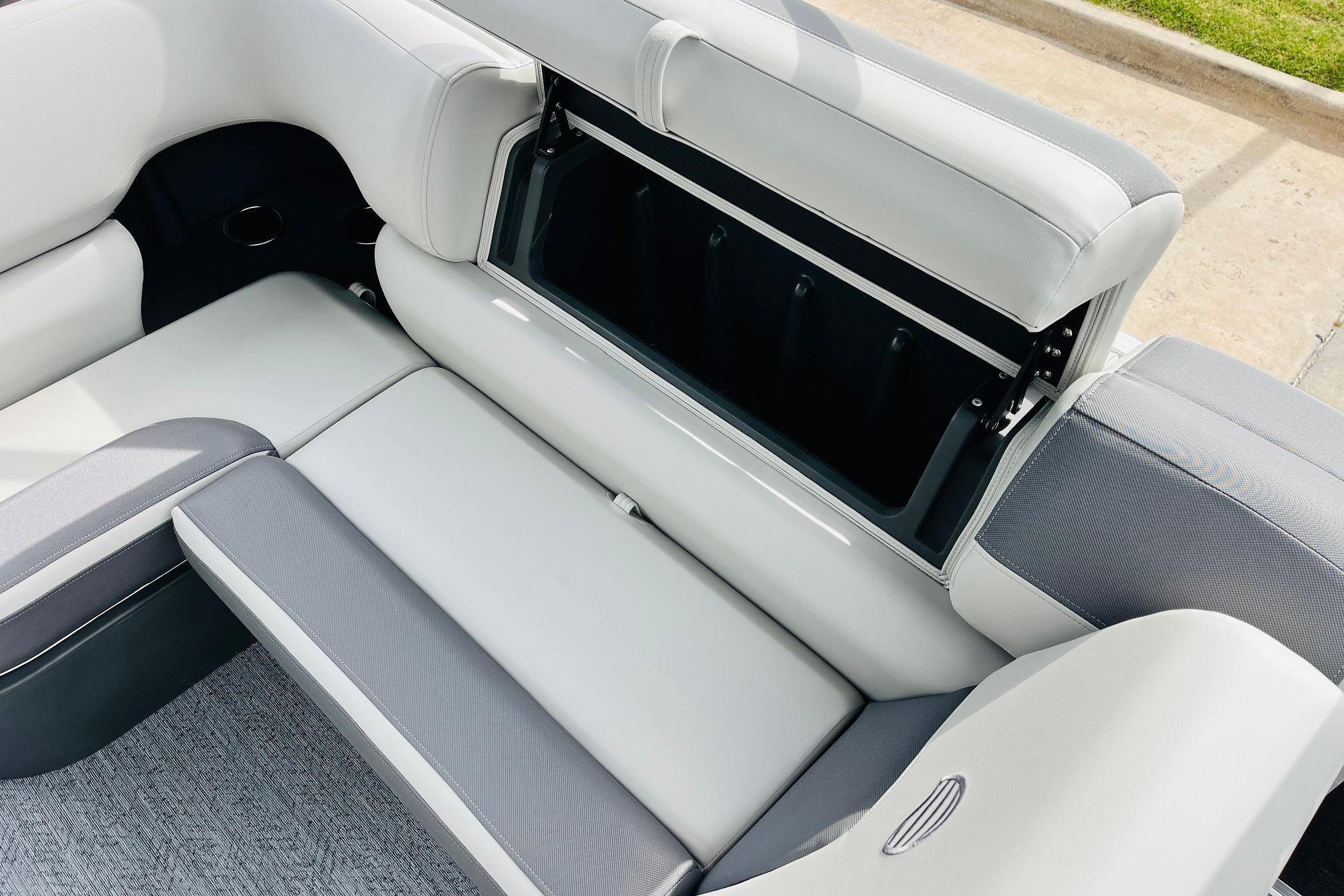 Those who are just along for the ride can relax in the 2 lounge seats with plenty of drink holders and a removable table. Those seats also boast the STOW MORE system, which secrets away storage areas under the seat cushions and seat backs. If the sun's beating down on you, put up the 9' QuickLift bimini top for some cool shade. Create a soundtrack for your trip with the standard Wet Sounds stereo with Bluetooth and 2 upholstery speakers. The wraparound fence and 3 inward swinging doors keep kids safe. The rear features a reboarding platform with a telescoping ladder with extra wide steps.