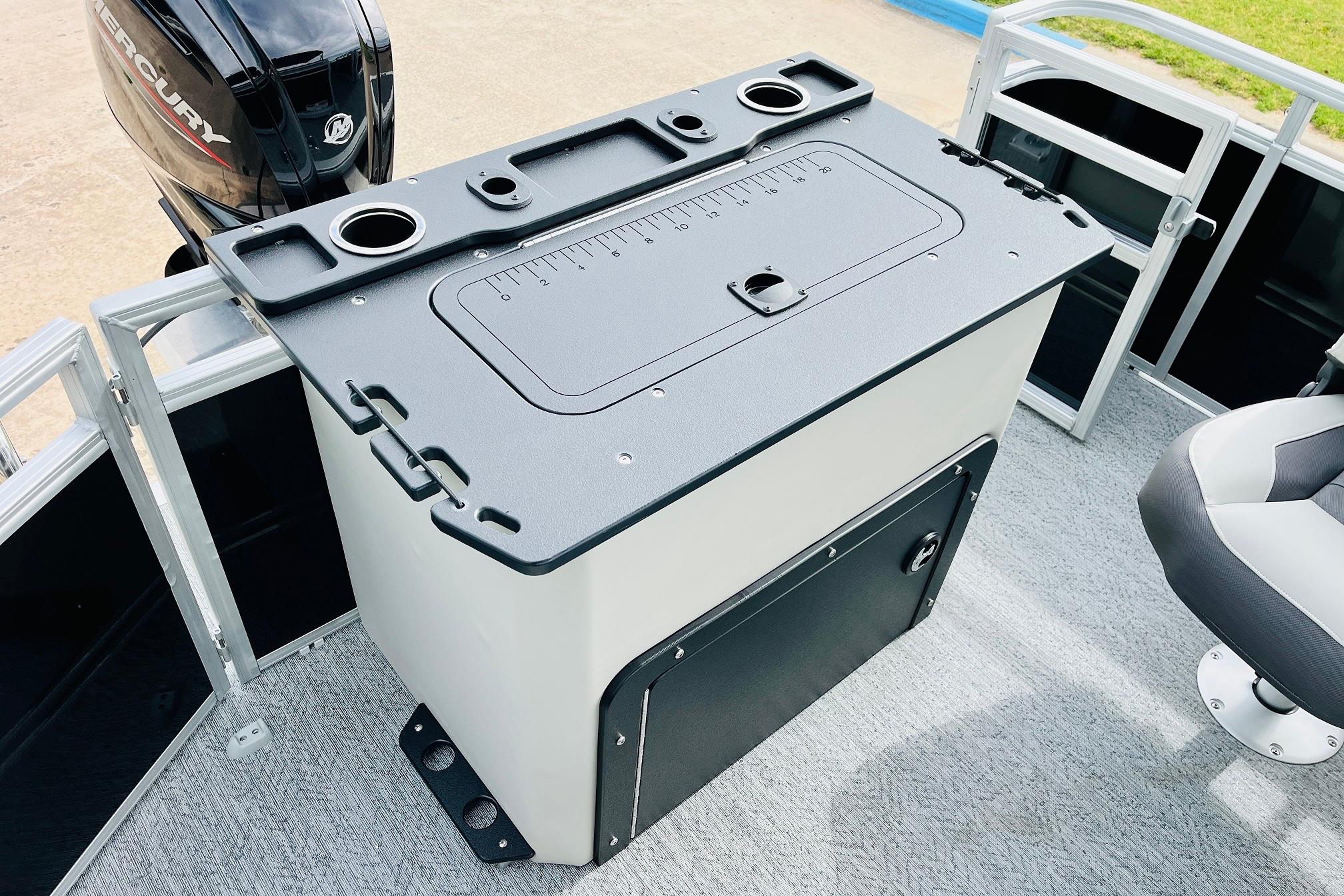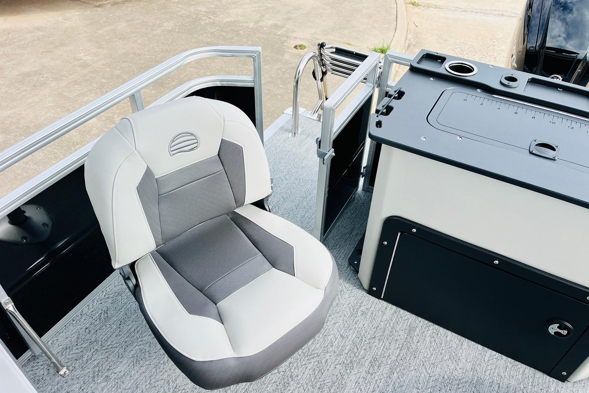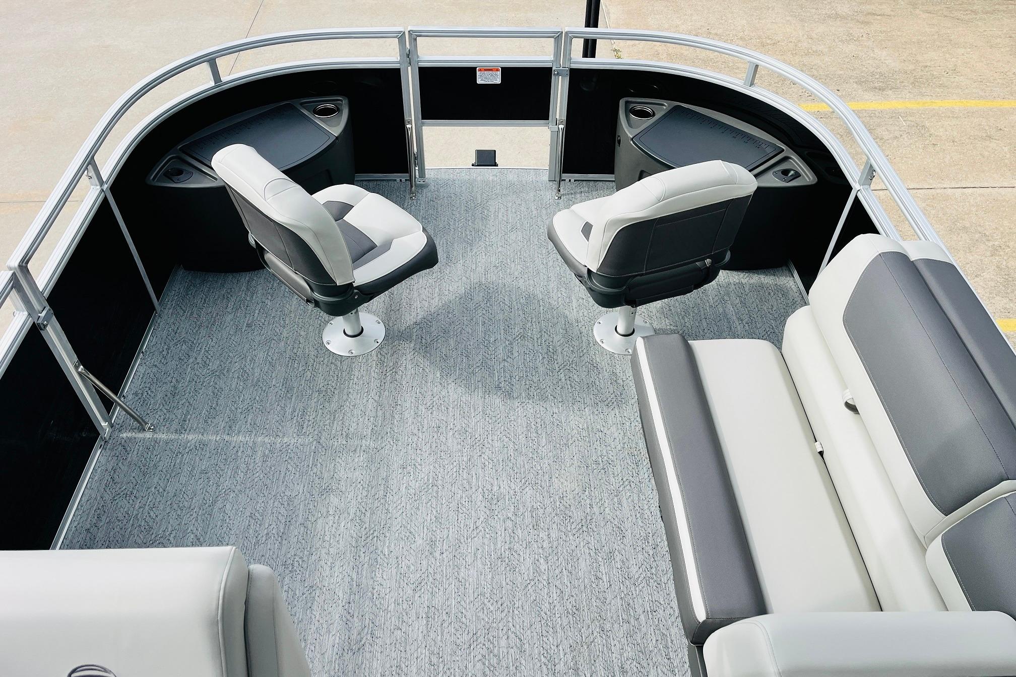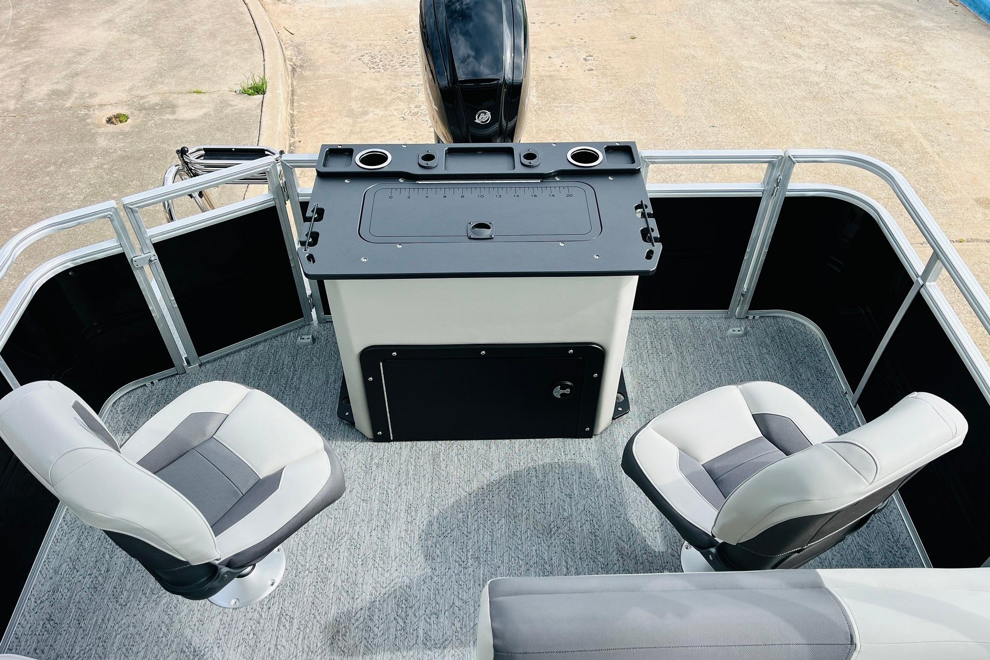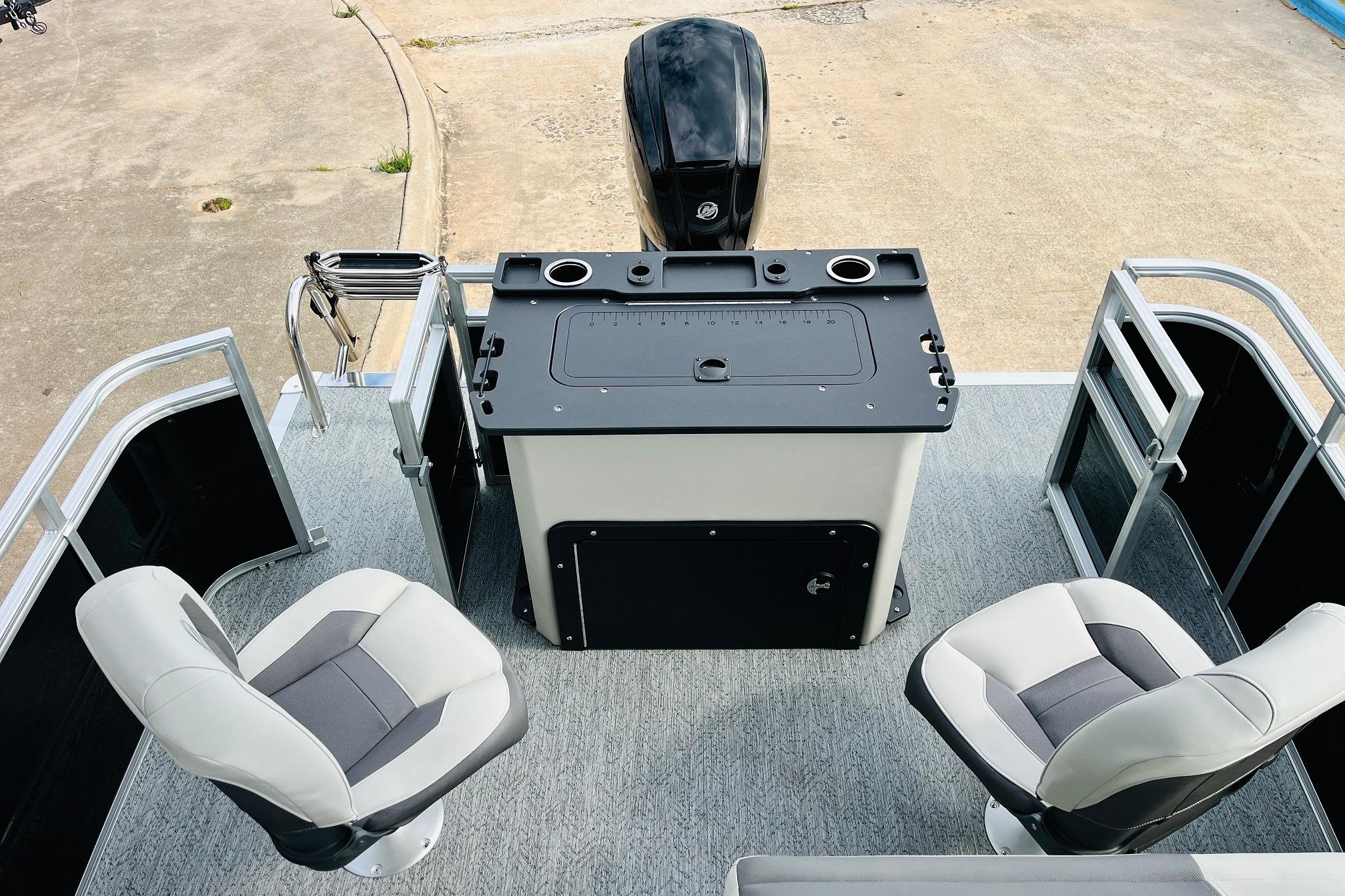 The 2026 FISHIN' BARGE 20 DLX takes fun seriously, and you will too when you're casting lines with the family from its 19' deck. Claim your favorite spot from either the fore or aft fishing decks, which boast 3 casting chairs, 2 aerated livewells, and rail-mounted holders ready to present your rods and tools. Those fishing chairs are removable and foldable to allow for deck customization. Both ends offer extra storage areas for tackle and tools.