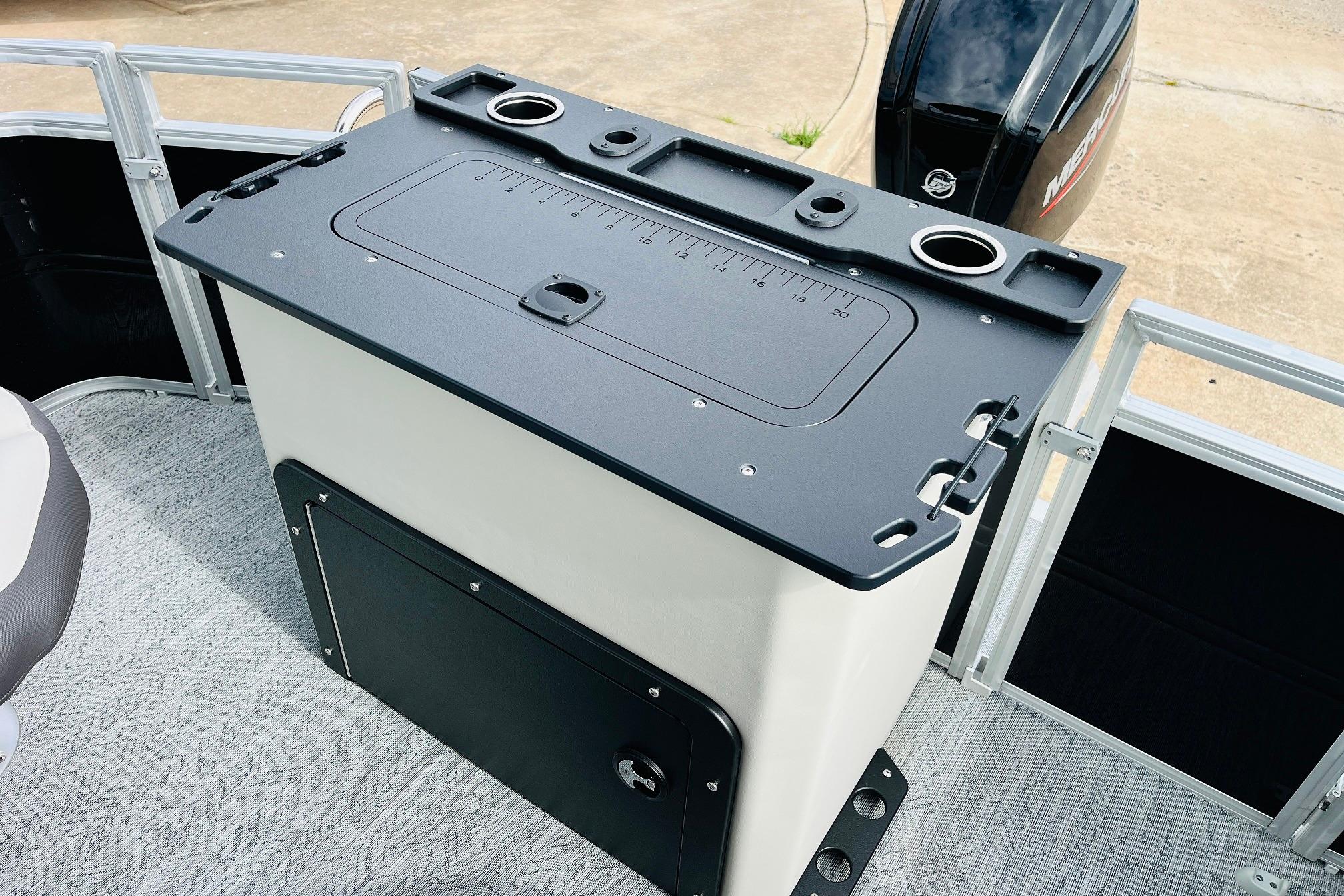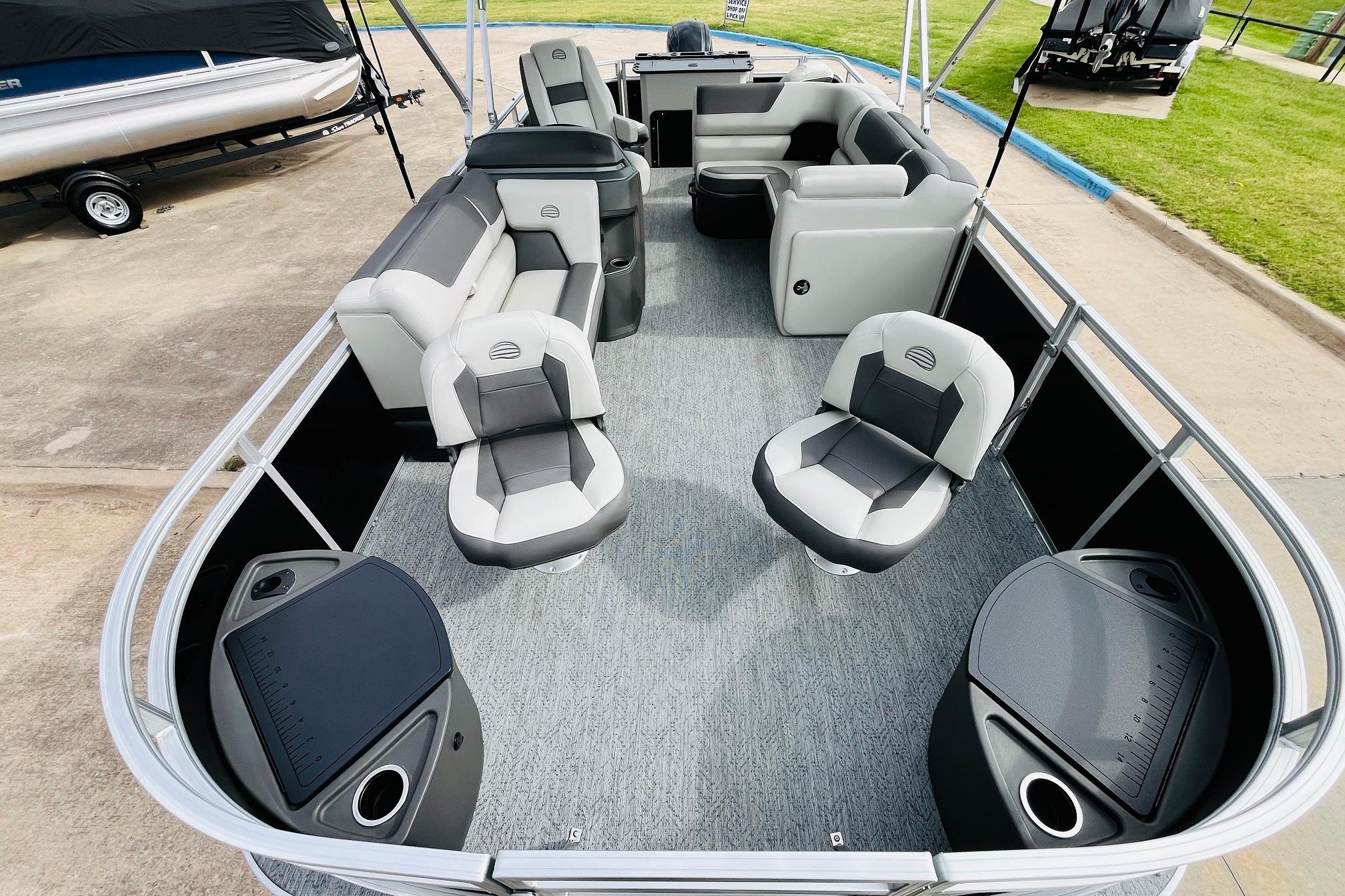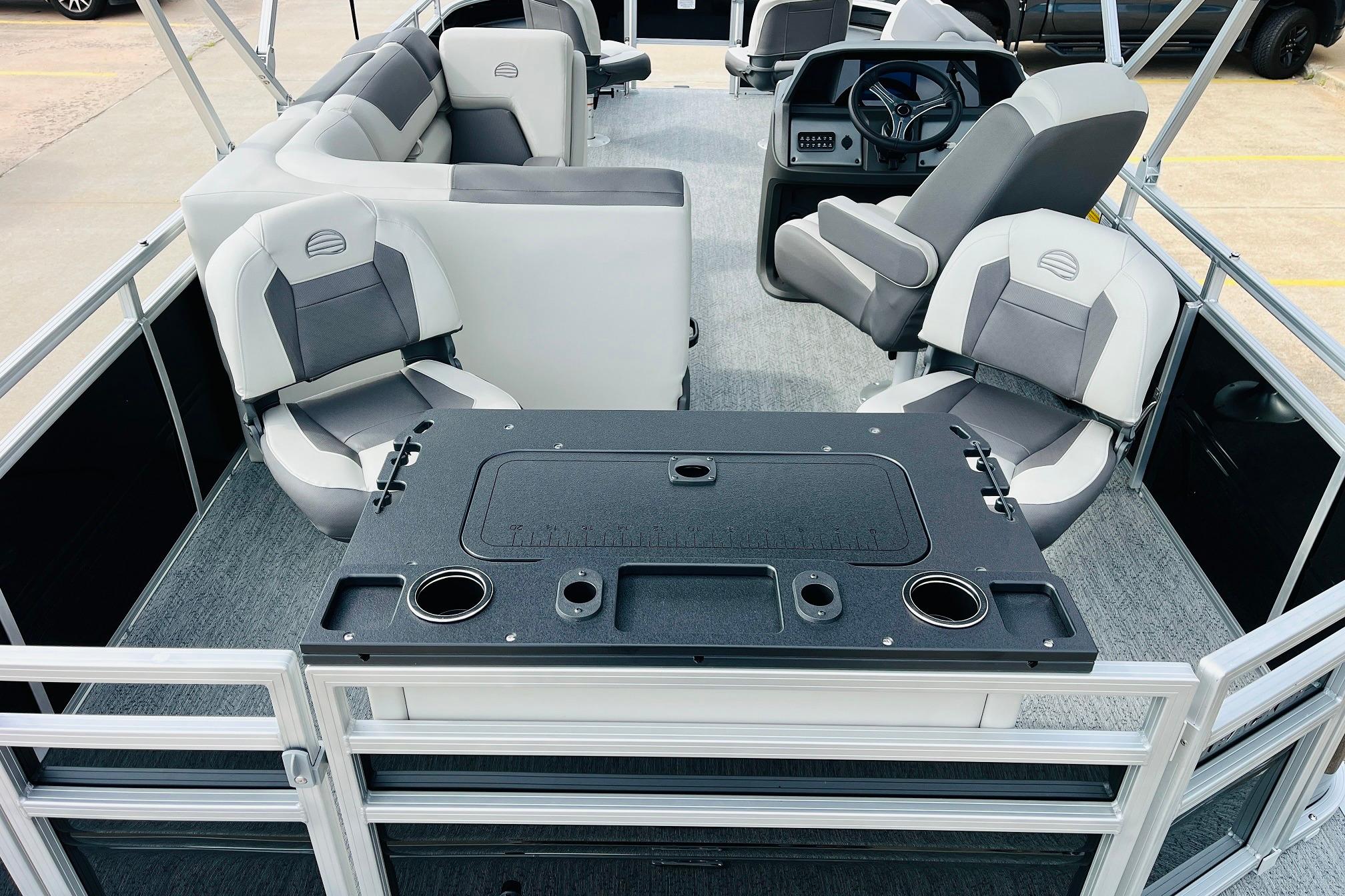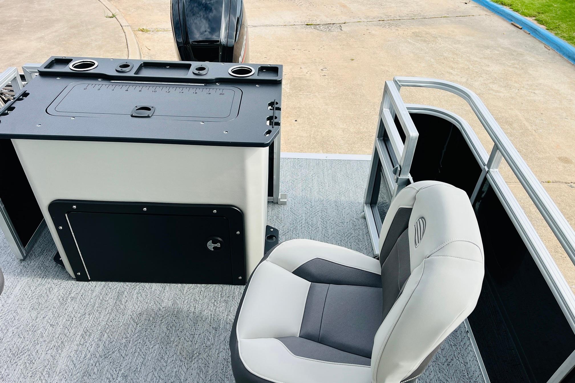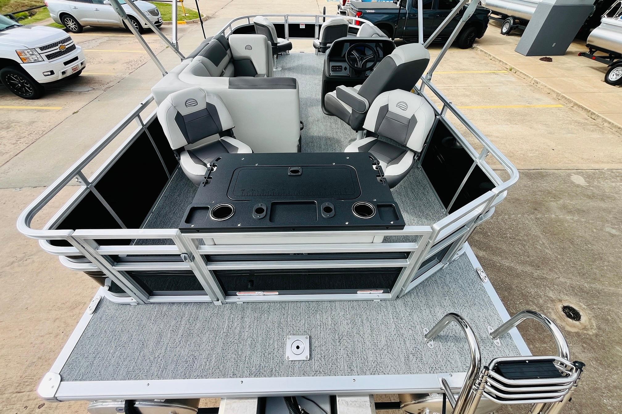 The 2026 FISHIN' BARGE 20 DLX takes fun seriously, and you will too when you're casting lines with the family from its 19' deck. Claim your favorite spot from either the fore or aft fishing decks, which boast 3 casting chairs, 2 aerated livewells, and rail-mounted holders ready to present your rods and tools. Those fishing chairs are removable and foldable to allow for deck customization. Both ends offer extra storage areas for tackle and tools.