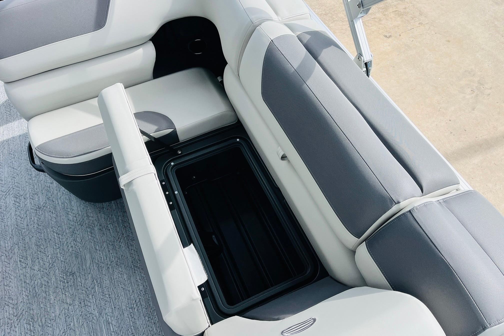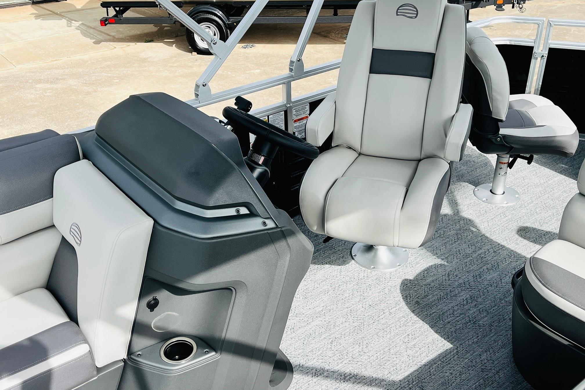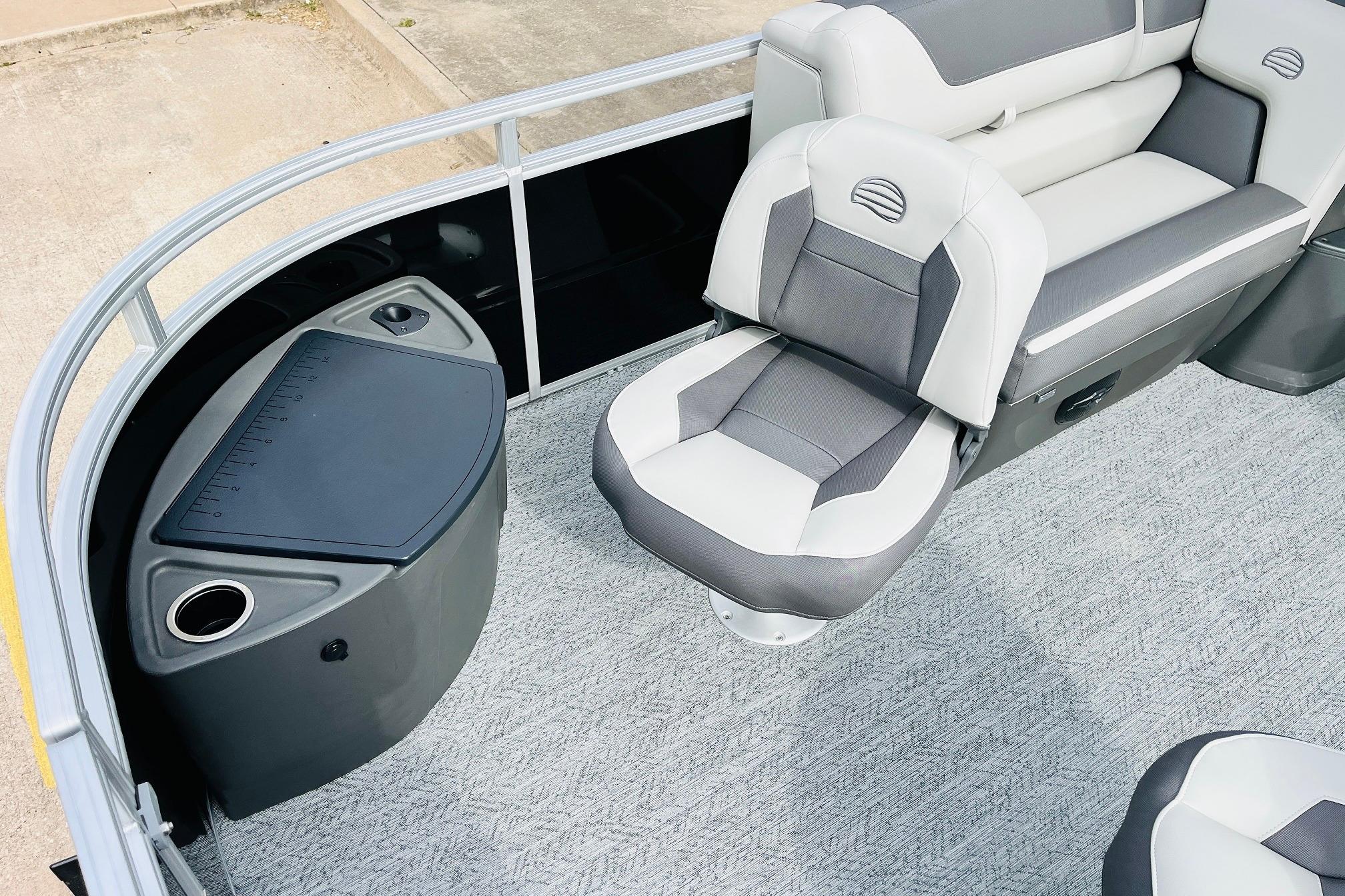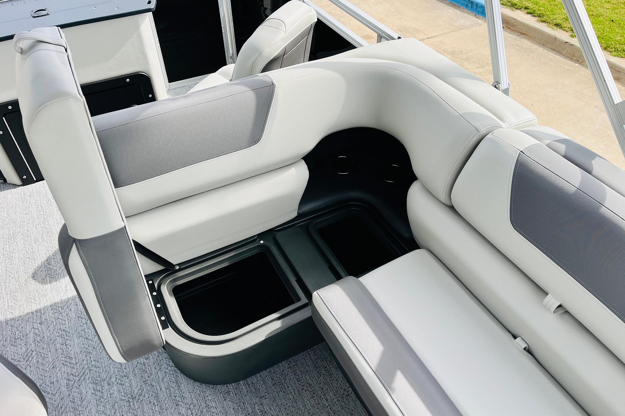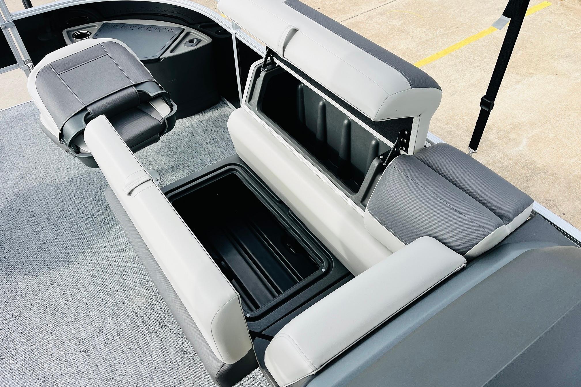 The 2026 FISHIN' BARGE 20 DLX takes fun seriously, and you will too when you're casting lines with the family from its 19' deck. Claim your favorite spot from either the fore or aft fishing decks, which boast 3 casting chairs, 2 aerated livewells, and rail-mounted holders ready to present your rods and tools. Those fishing chairs are removable and foldable to allow for deck customization. Both ends offer extra storage areas for tackle and tools.