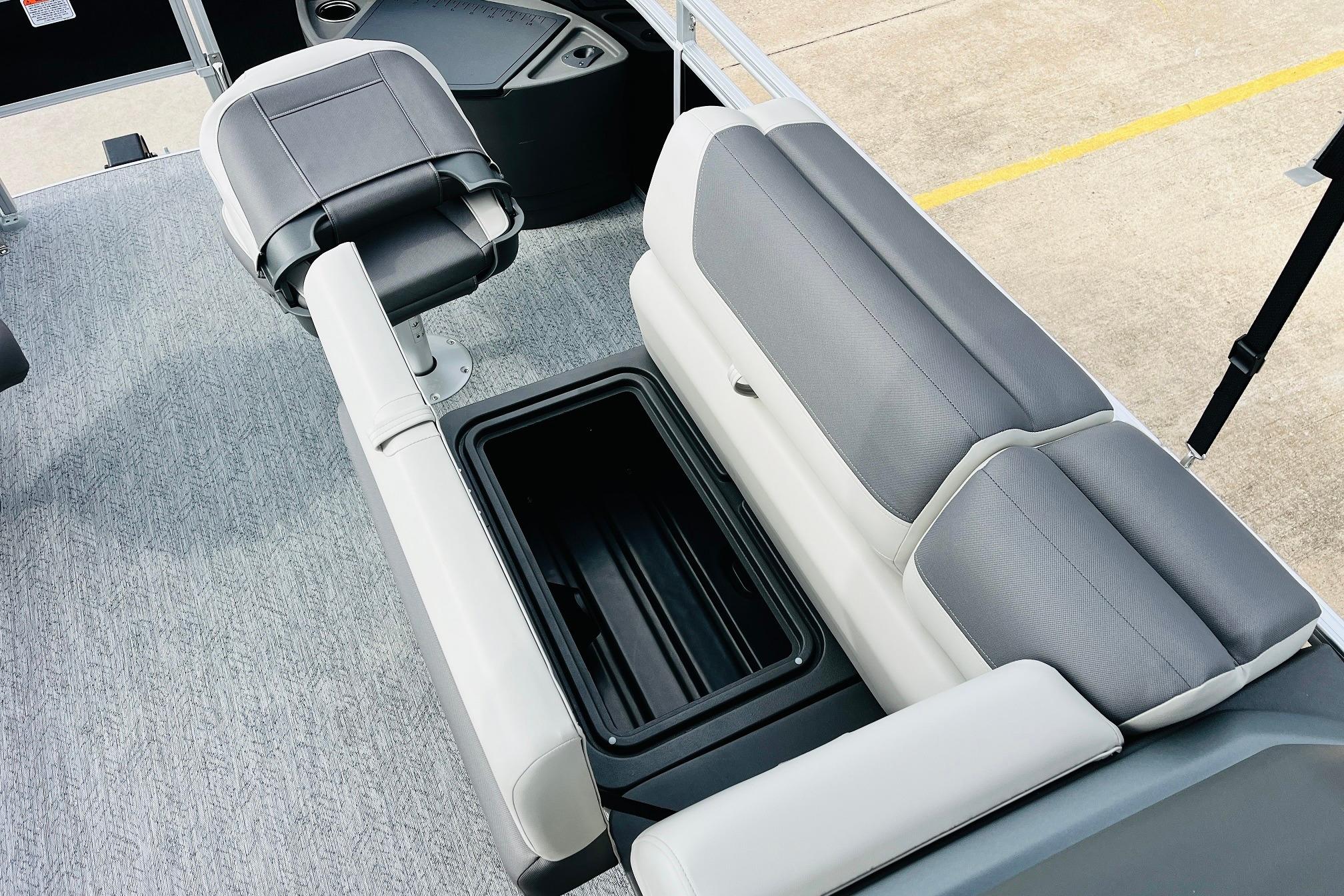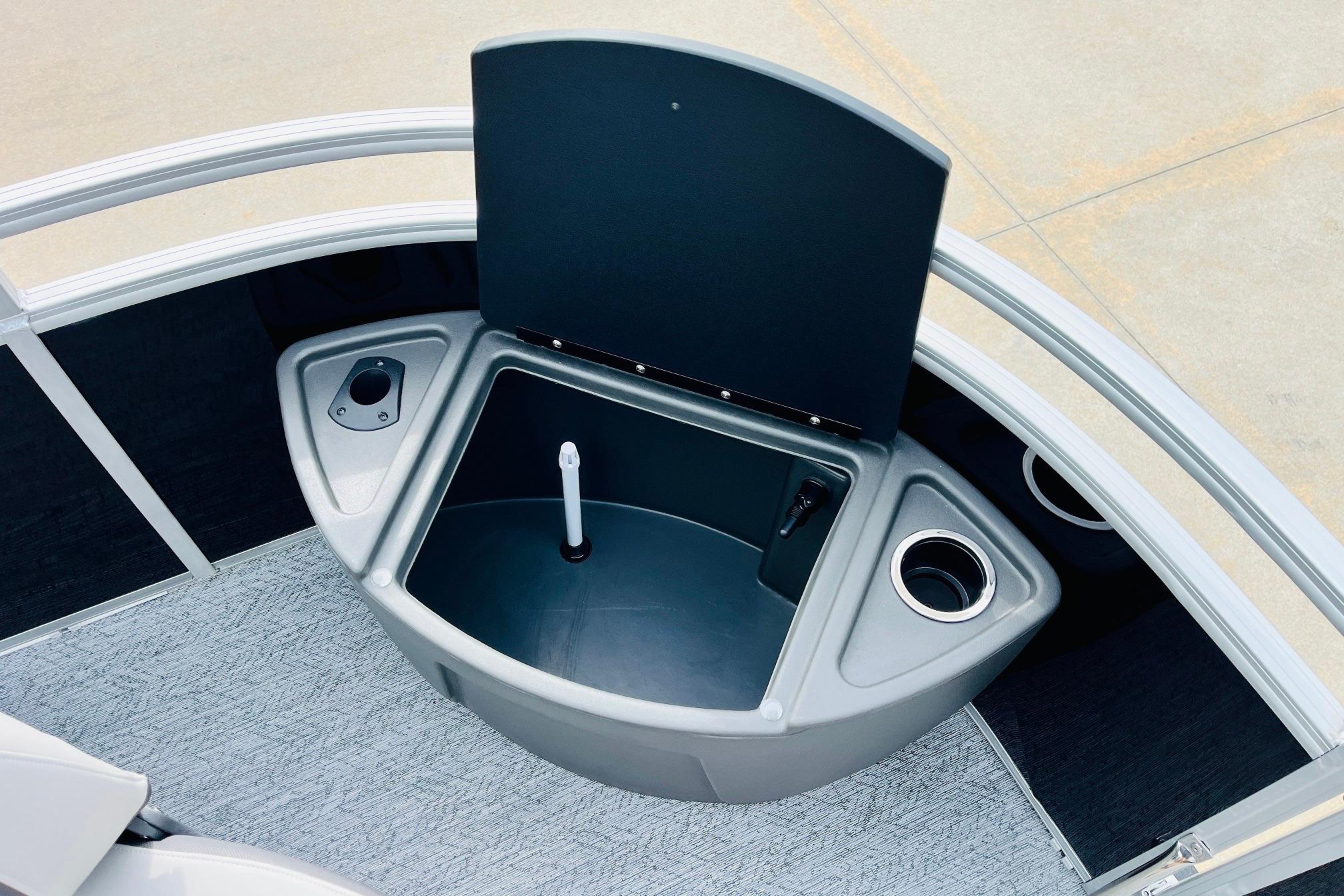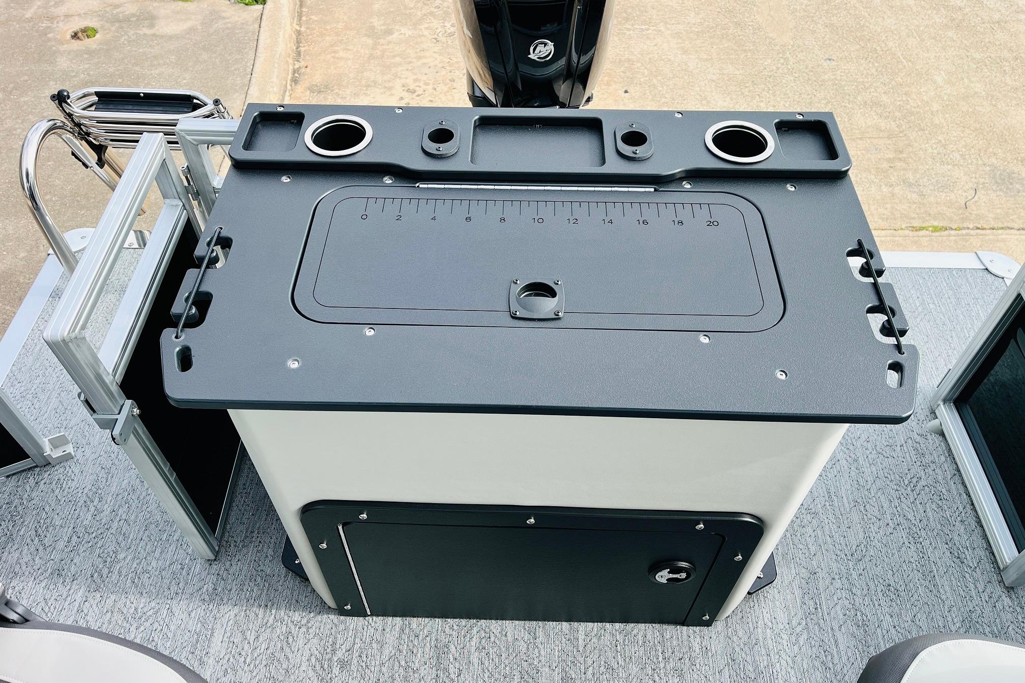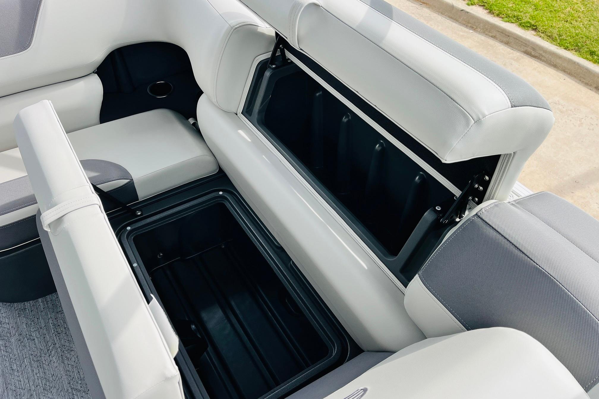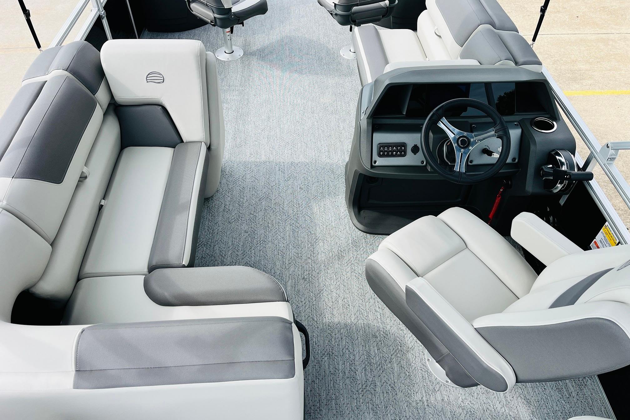 The 2026 FISHIN' BARGE 20 DLX takes fun seriously, and you will too when you're casting lines with the family from its 19' deck. Claim your favorite spot from either the fore or aft fishing decks, which boast 3 casting chairs, 2 aerated livewells, and rail-mounted holders ready to present your rods and tools. Those fishing chairs are removable and foldable to allow for deck customization. Both ends offer extra storage areas for tackle and tools.
