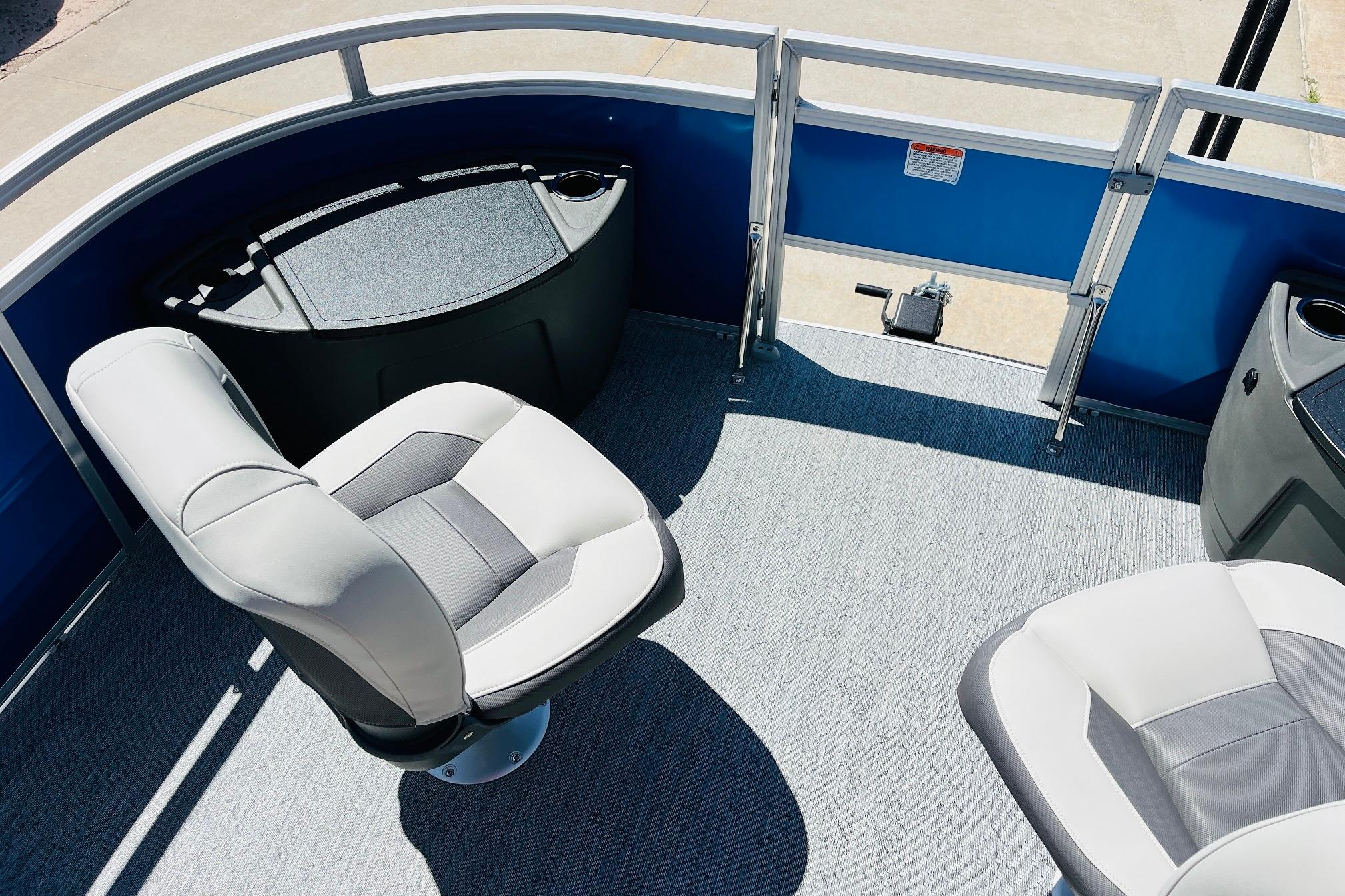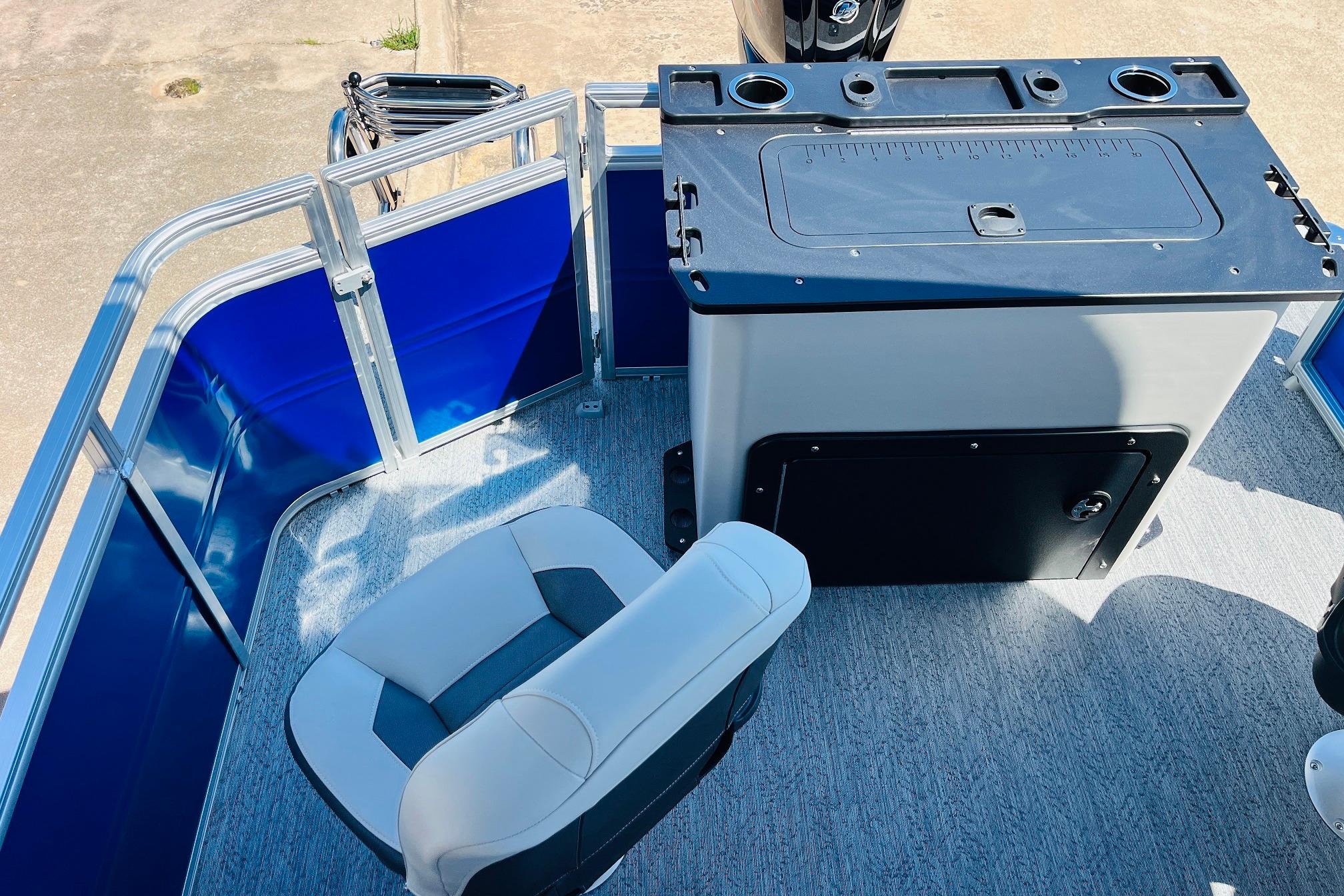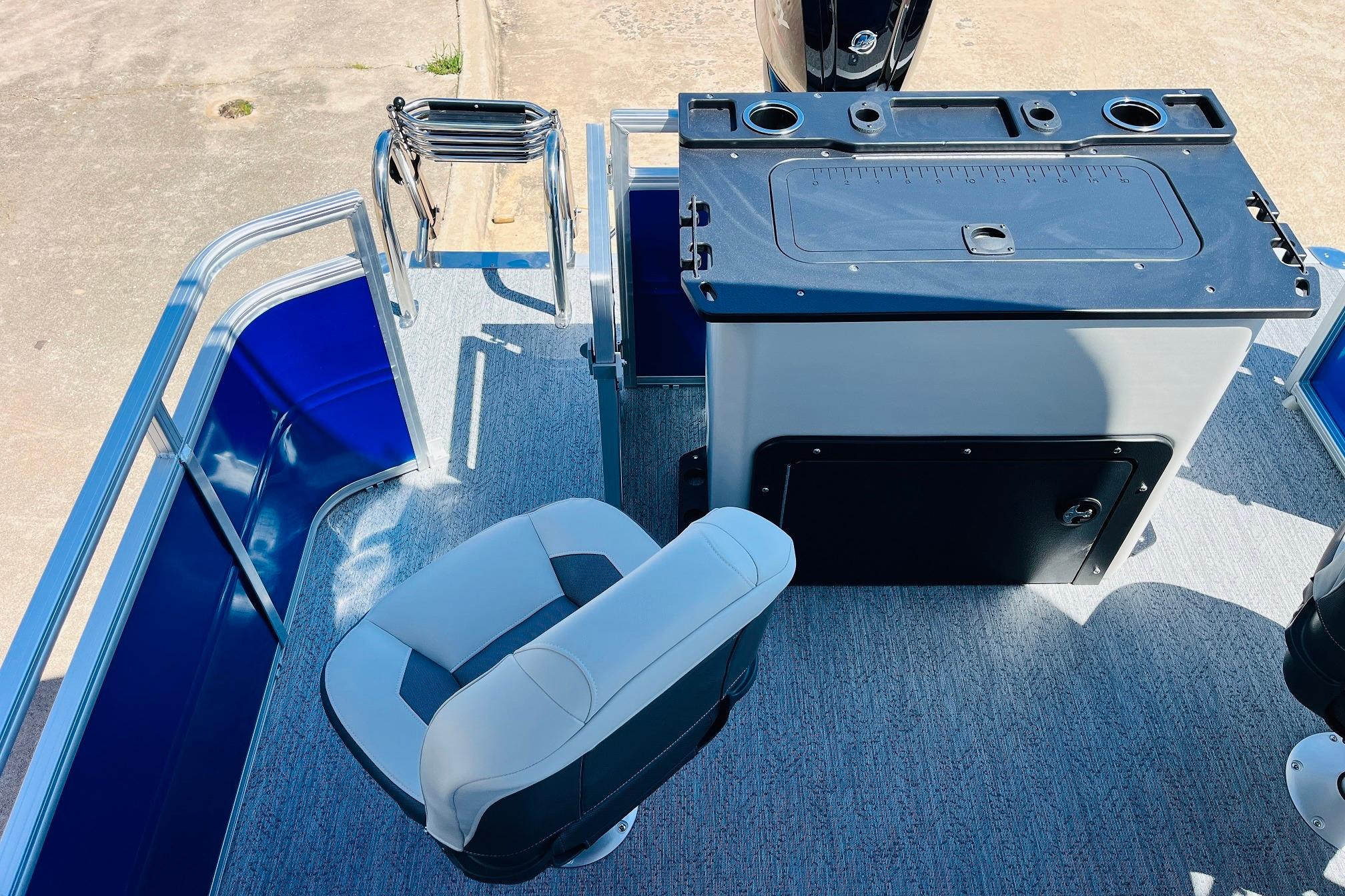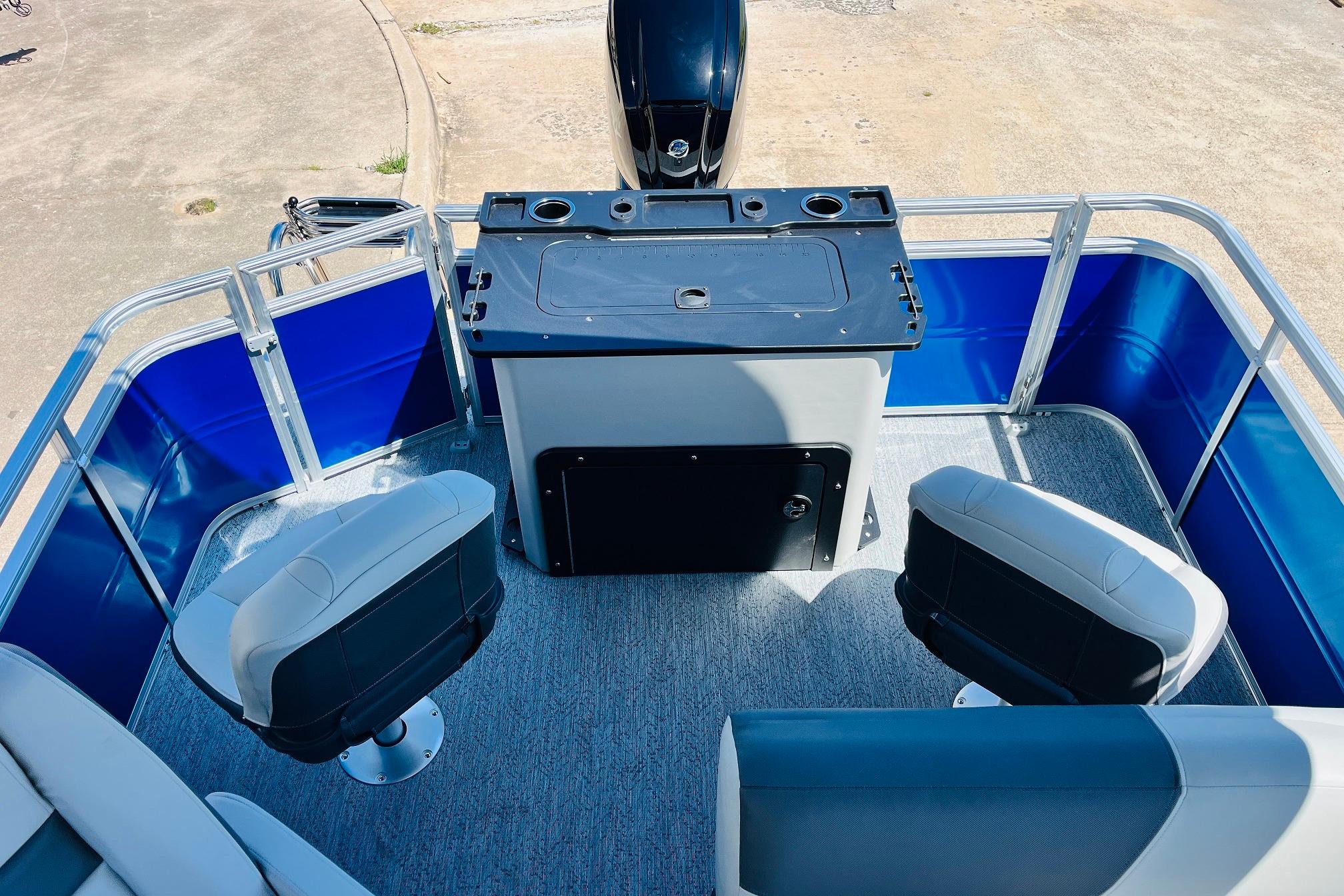 The 2026 FISHIN' BARGE 20 DLX takes fun seriously, and you will too when you're casting lines with the family from its 19' deck. Claim your favorite spot from either the fore or aft fishing decks, which boast 3 casting chairs, 2 aerated livewells, and rail-mounted holders ready to present your rods and tools. Those fishing chairs are removable and foldable to allow for deck customization. Both ends offer extra storage areas for tackle and tools.Those who are just along for the ride can relax in the 2 lounge seats with plenty of drink holders and a removable table. Those seats also boast the STOW MORE system, which secrets away storage areas under the seat cushions and seat backs. If the sun's beating down on you, put up the 9' QuickLift bimini top for some cool shade. Create a soundtrack for your trip with the standard Wet Sounds stereo with Bluetooth and 2 upholstery speakers. The wraparound fence and 3 inward swinging doors keep kids safe. The rear features a reboarding platform with a telescoping ladder with extra wide steps.