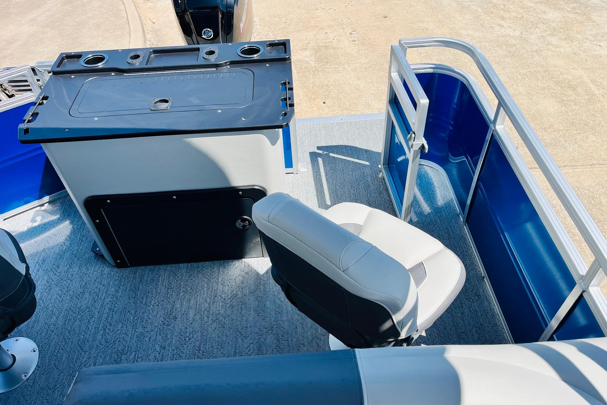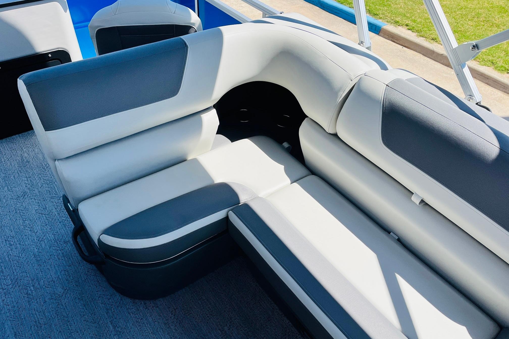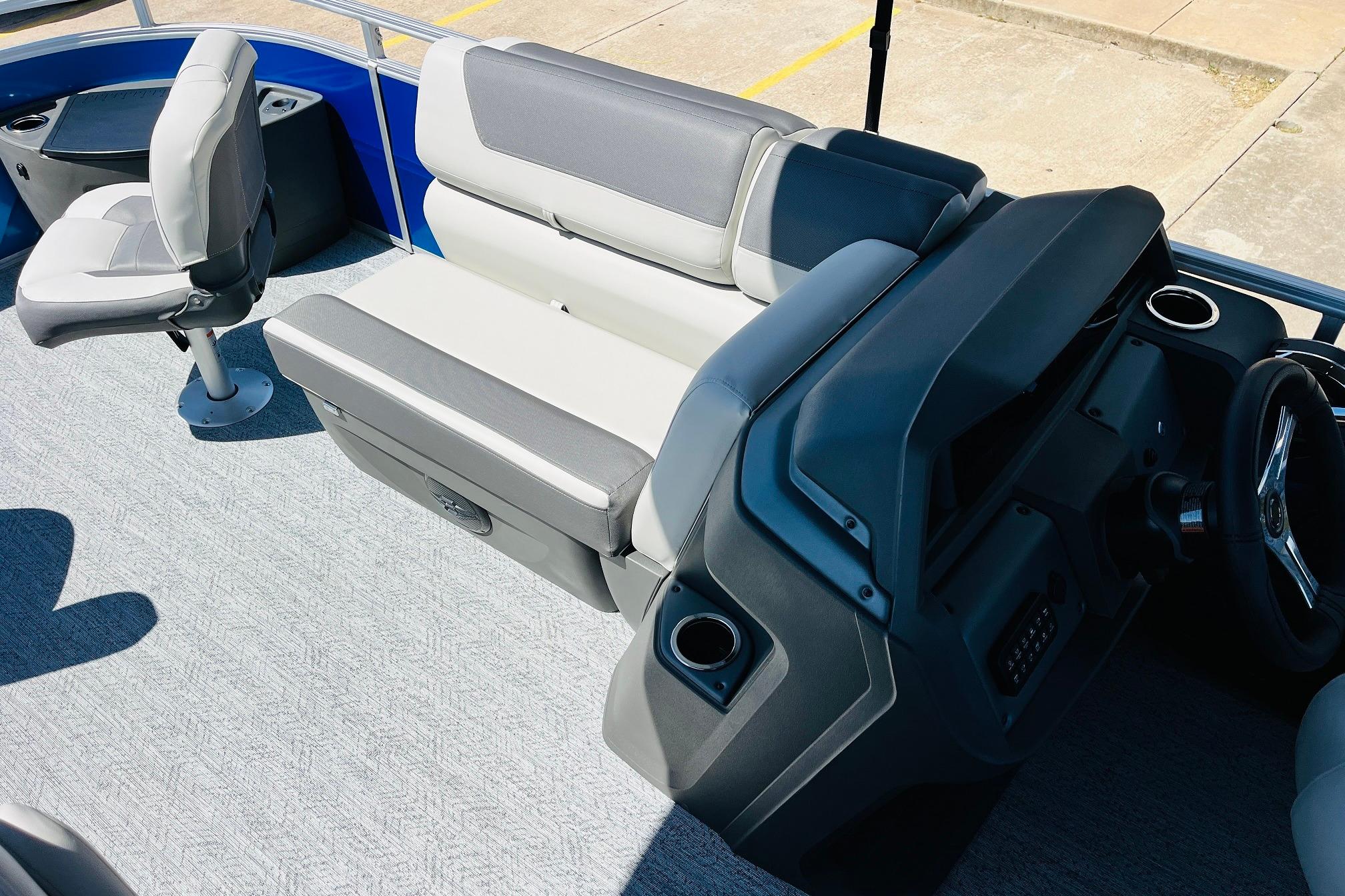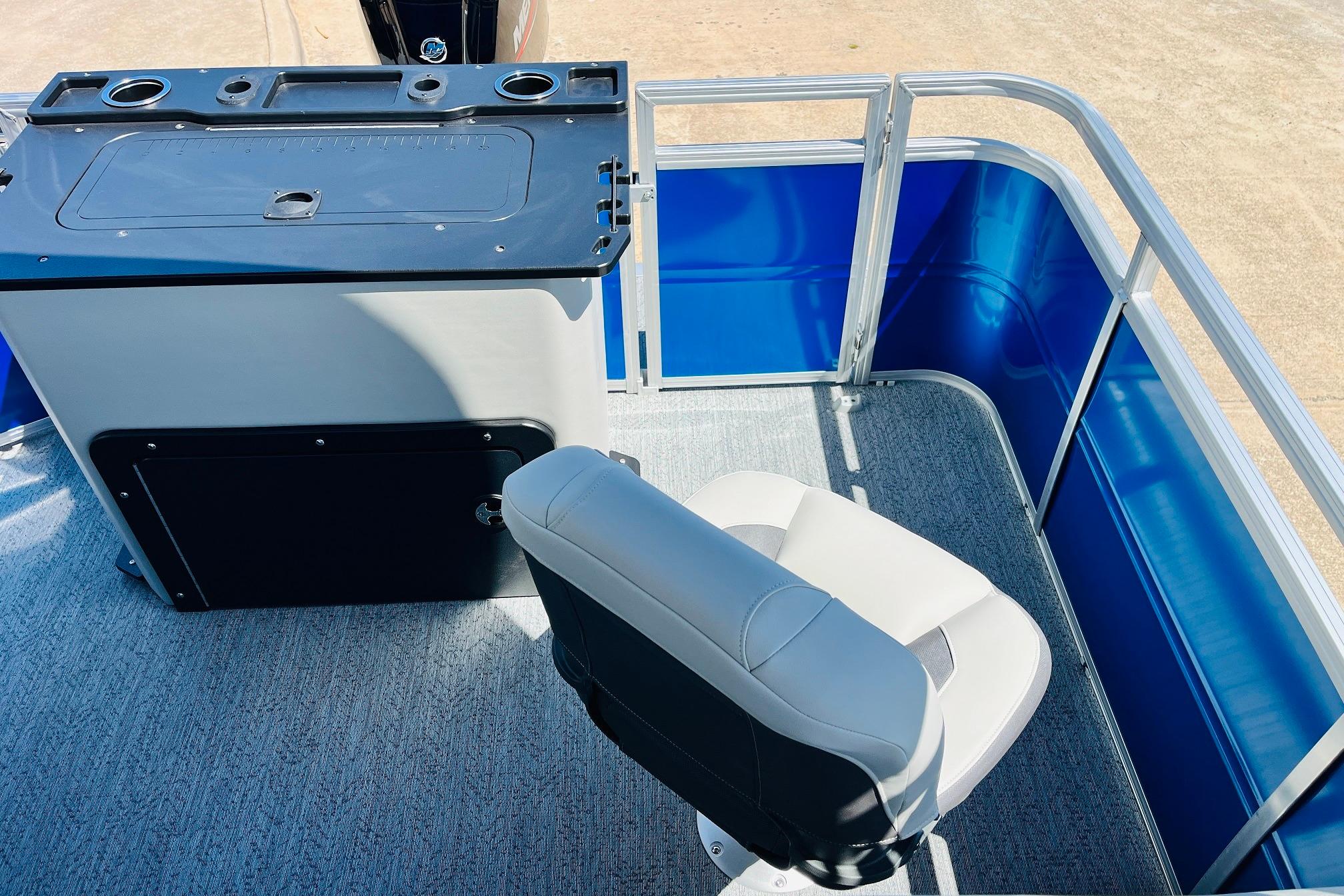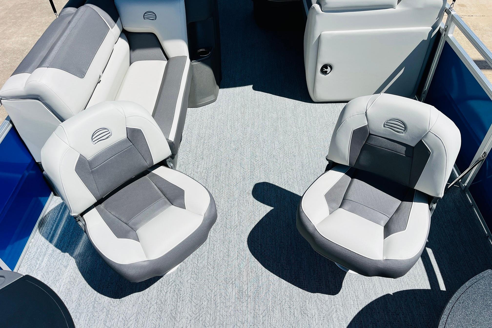 The 2026 FISHIN' BARGE 20 DLX takes fun seriously, and you will too when you're casting lines with the family from its 19' deck. Claim your favorite spot from either the fore or aft fishing decks, which boast 3 casting chairs, 2 aerated livewells, and rail-mounted holders ready to present your rods and tools. Those fishing chairs are removable and foldable to allow for deck customization. Both ends offer extra storage areas for tackle and tools.Those who are just along for the ride can relax in the 2 lounge seats with plenty of drink holders and a removable table. Those seats also boast the STOW MORE system, which secrets away storage areas under the seat cushions and seat backs. If the sun's beating down on you, put up the 9' QuickLift bimini top for some cool shade. Create a soundtrack for your trip with the standard Wet Sounds stereo with Bluetooth and 2 upholstery speakers. The wraparound fence and 3 inward swinging doors keep kids safe. The rear features a reboarding platform with a telescoping ladder with extra wide steps.