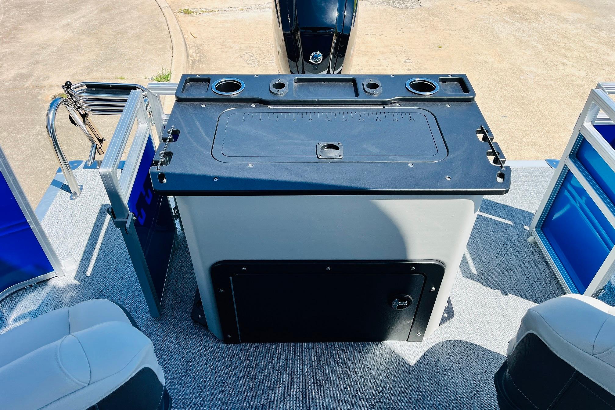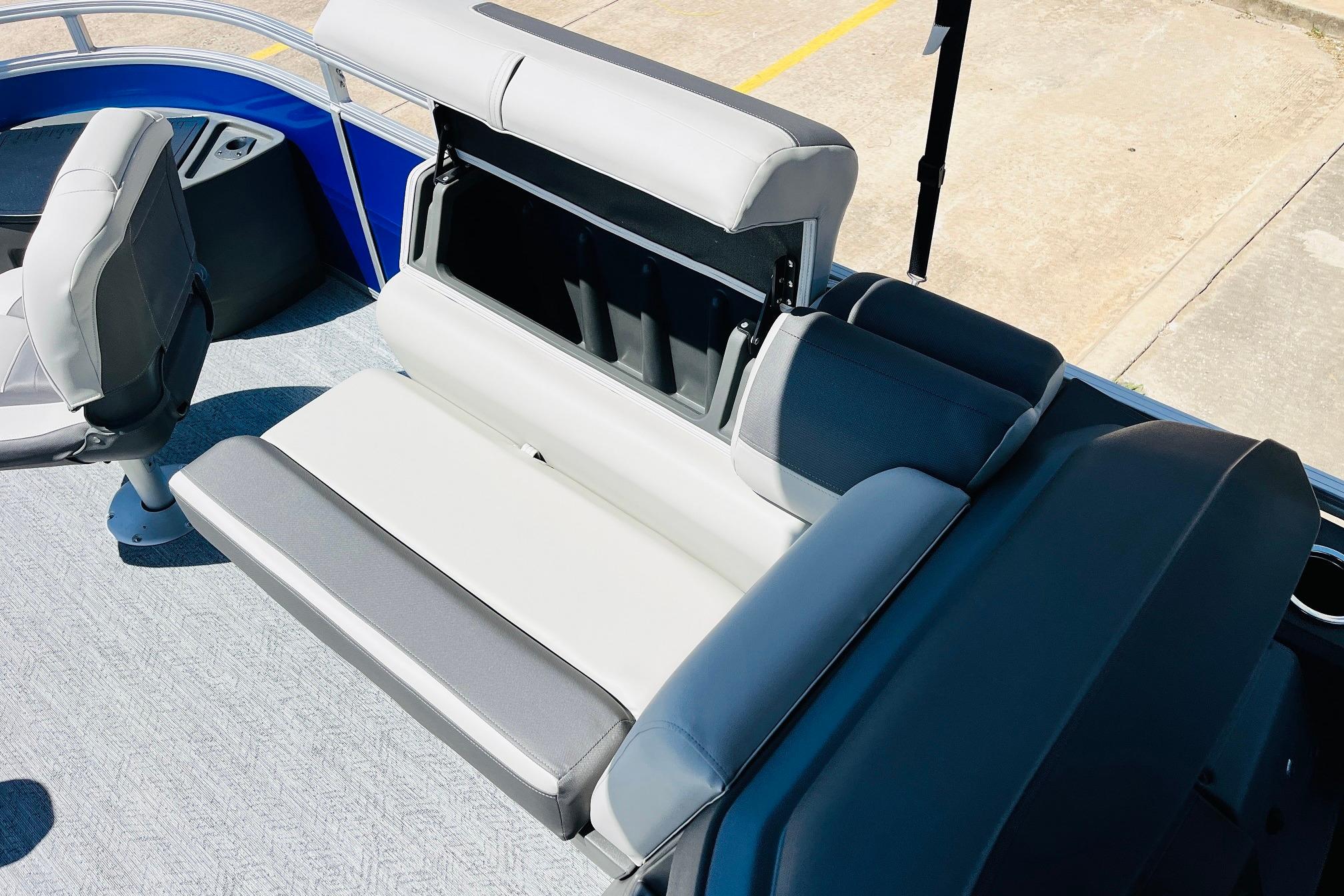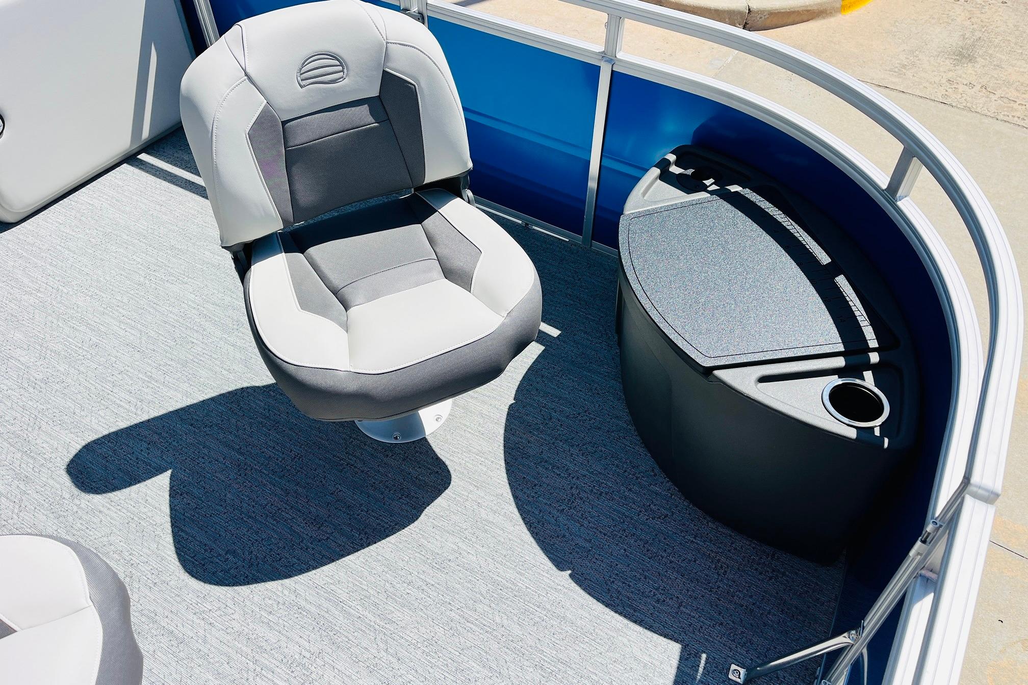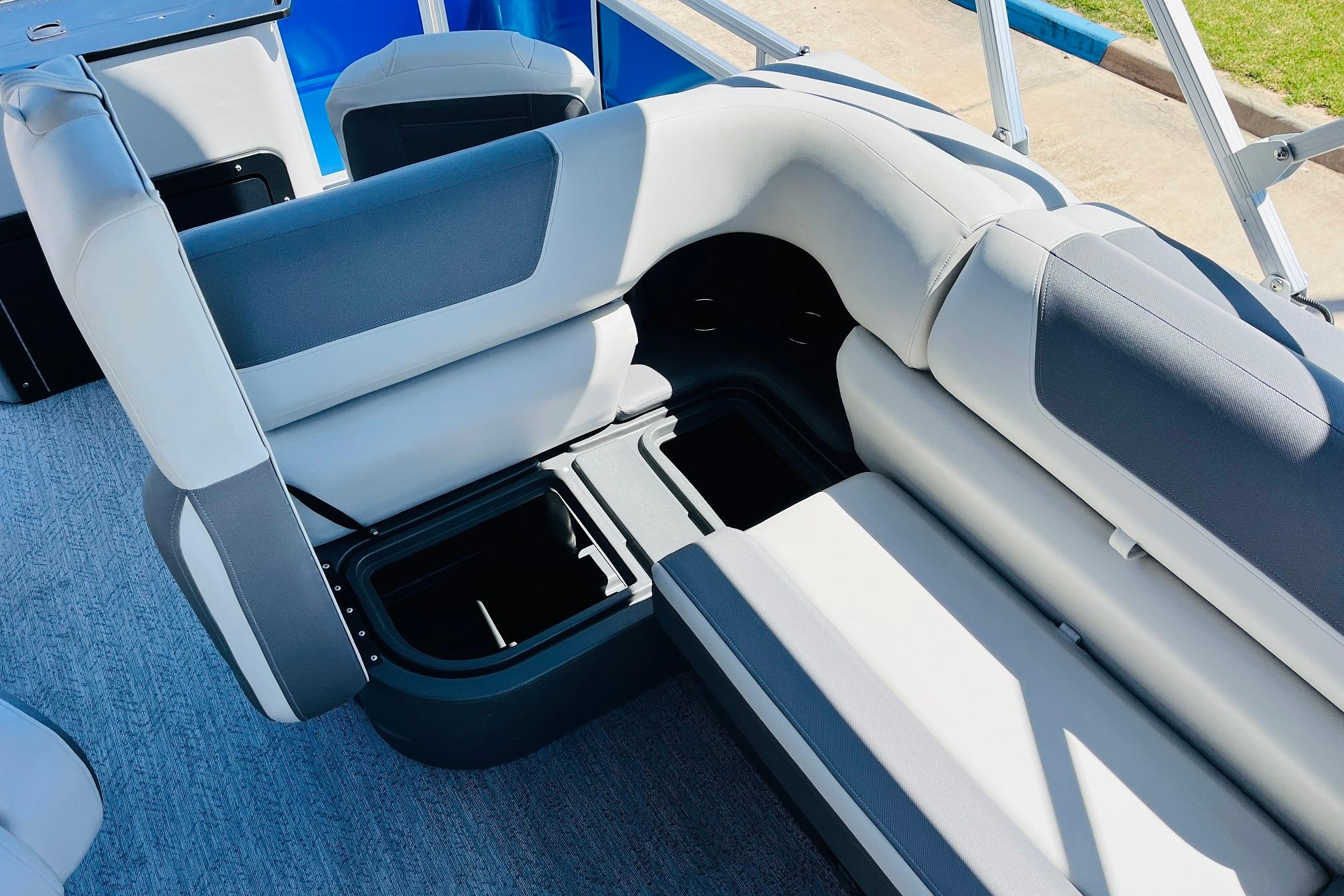 The 2026 FISHIN' BARGE 20 DLX takes fun seriously, and you will too when you're casting lines with the family from its 19' deck. Claim your favorite spot from either the fore or aft fishing decks, which boast 3 casting chairs, 2 aerated livewells, and rail-mounted holders ready to present your rods and tools. Those fishing chairs are removable and foldable to allow for deck customization. Both ends offer extra storage areas for tackle and tools.Those who are just along for the ride can relax in the 2 lounge seats with plenty of drink holders and a removable table. Those seats also boast the STOW MORE system, which secrets away storage areas under the seat cushions and seat backs. If the sun's beating down on you, put up the 9' QuickLift bimini top for some cool shade. Create a soundtrack for your trip with the standard Wet Sounds stereo with Bluetooth and 2 upholstery speakers. The wraparound fence and 3 inward swinging doors keep kids safe. The rear features a reboarding platform with a telescoping ladder with extra wide steps.