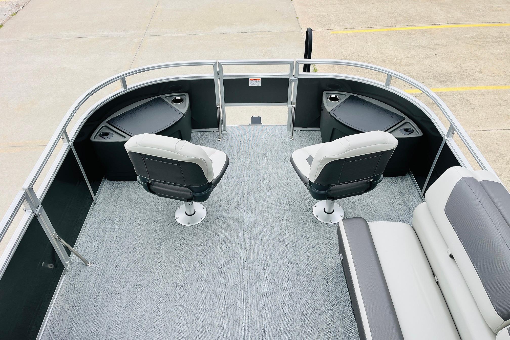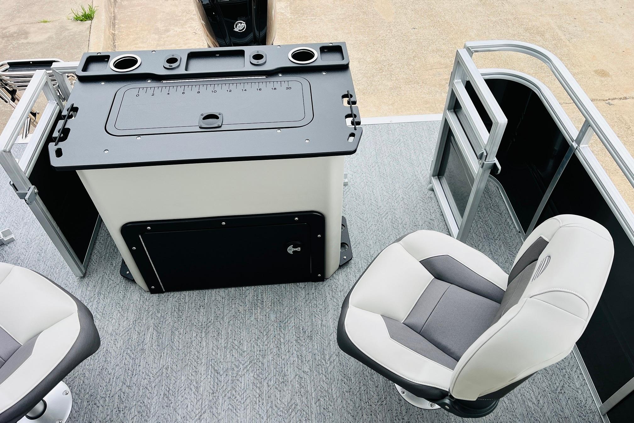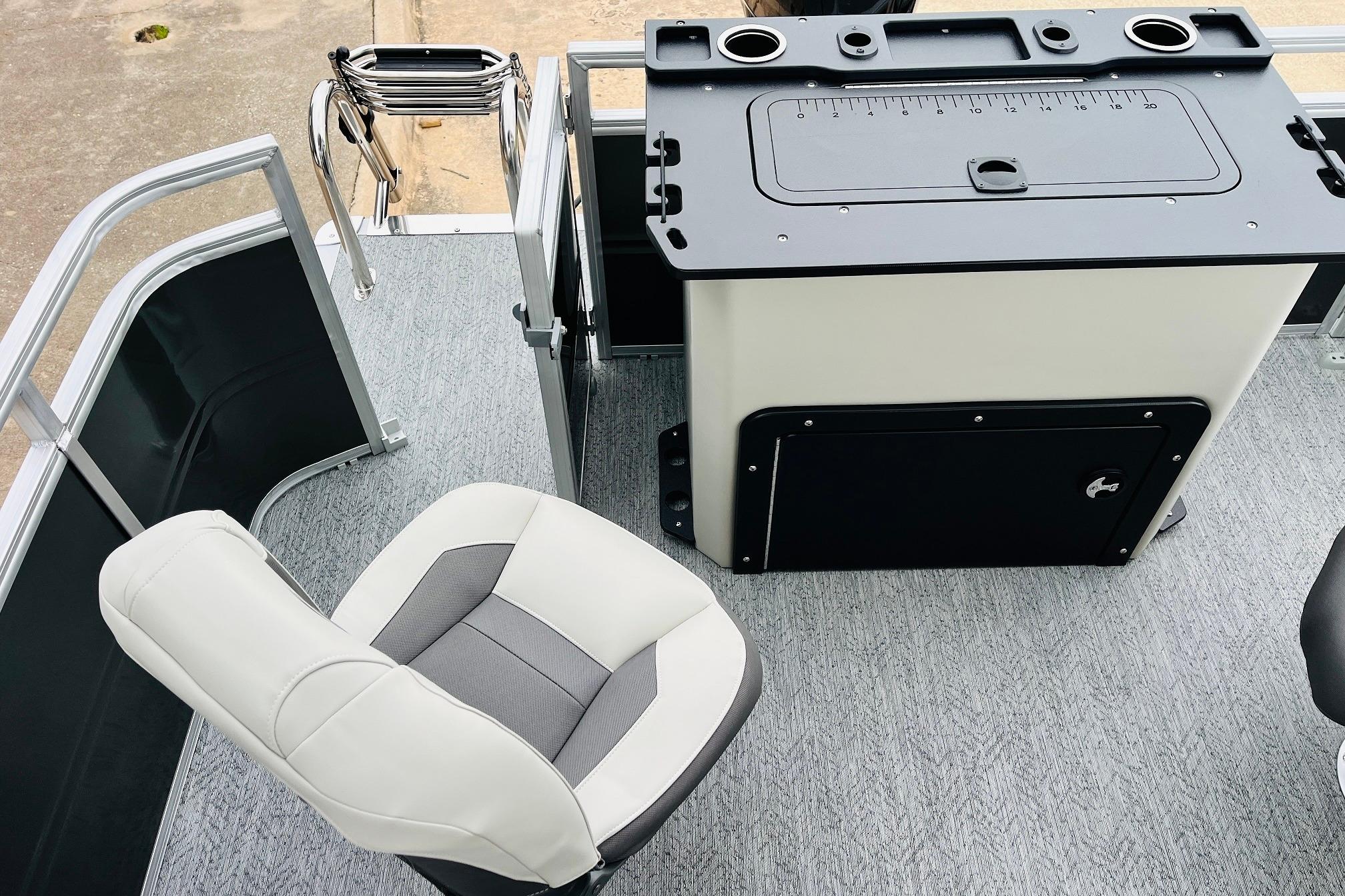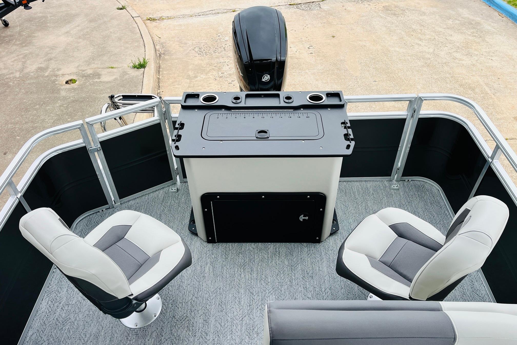 The 2026 FISHIN' BARGE 20 DLX takes fun seriously, and you will too when you're casting lines with the family from its 19' deck. Claim your favorite spot from either the fore or aft fishing decks, which boast 3 casting chairs, 2 aerated livewells, and rail-mounted holders ready to present your rods and tools. Those fishing chairs are removable and foldable to allow for deck customization. Both ends offer extra storage areas for tackle and tools.Those who are just along for the ride can relax in the 2 lounge seats with plenty of drink holders and a removable table. Those seats also boast the STOW MORE system, which secrets away storage areas under the seat cushions and seat backs. If the sun's beating down on you, put up the 9' QuickLift bimini top for some cool shade. Create a soundtrack for your trip with the standard Wet Sounds stereo with Bluetooth and 2 upholstery speakers. The wraparound fence and 3 inward swinging doors keep kids safe. The rear features a reboarding platform with a telescoping ladder with extra wide steps.