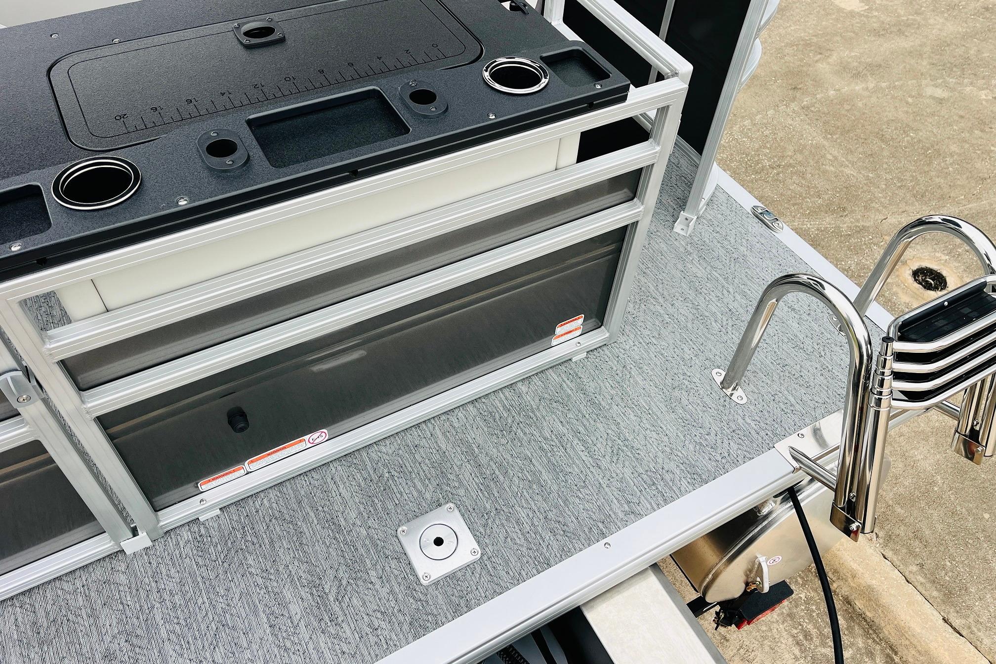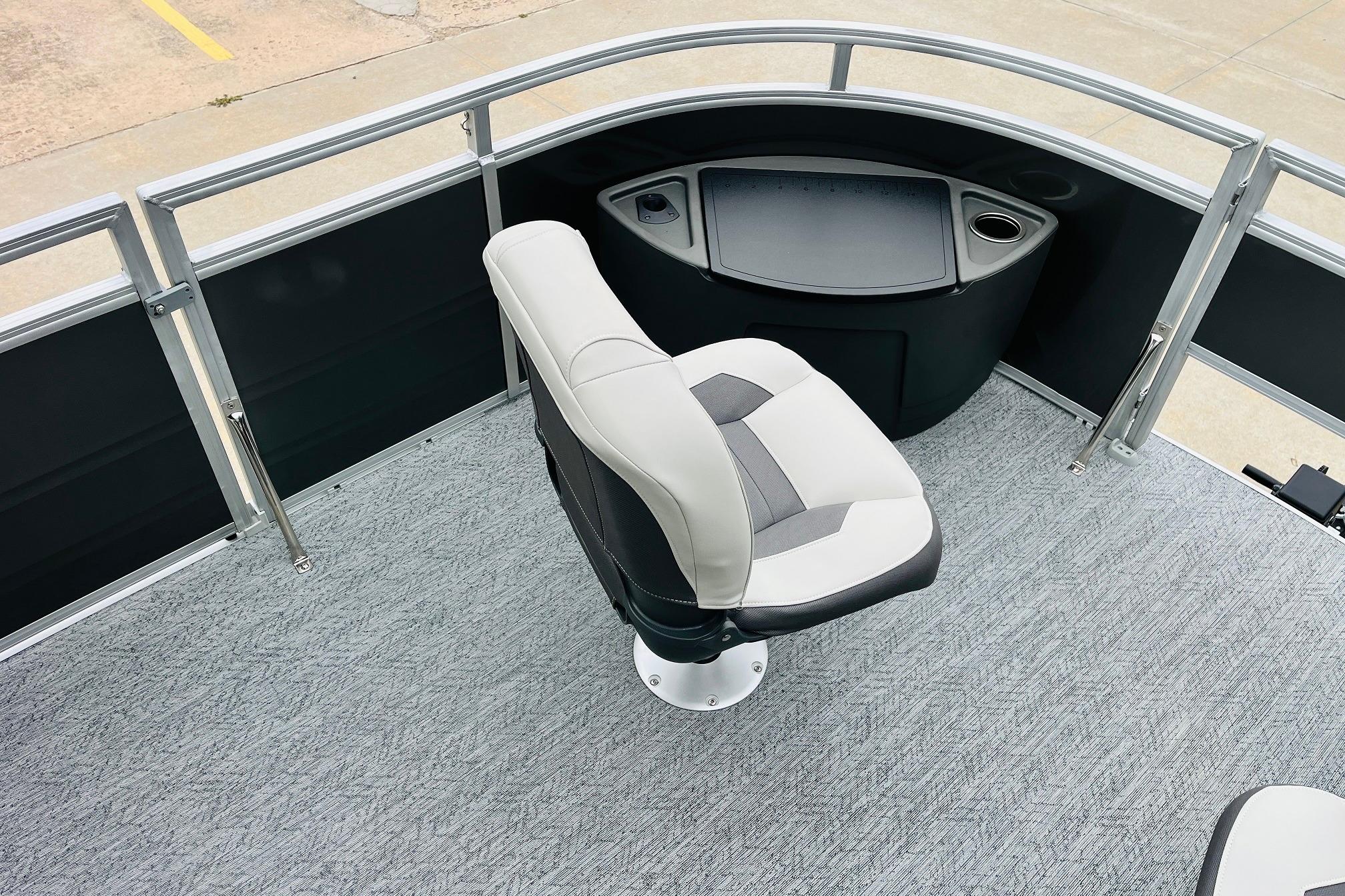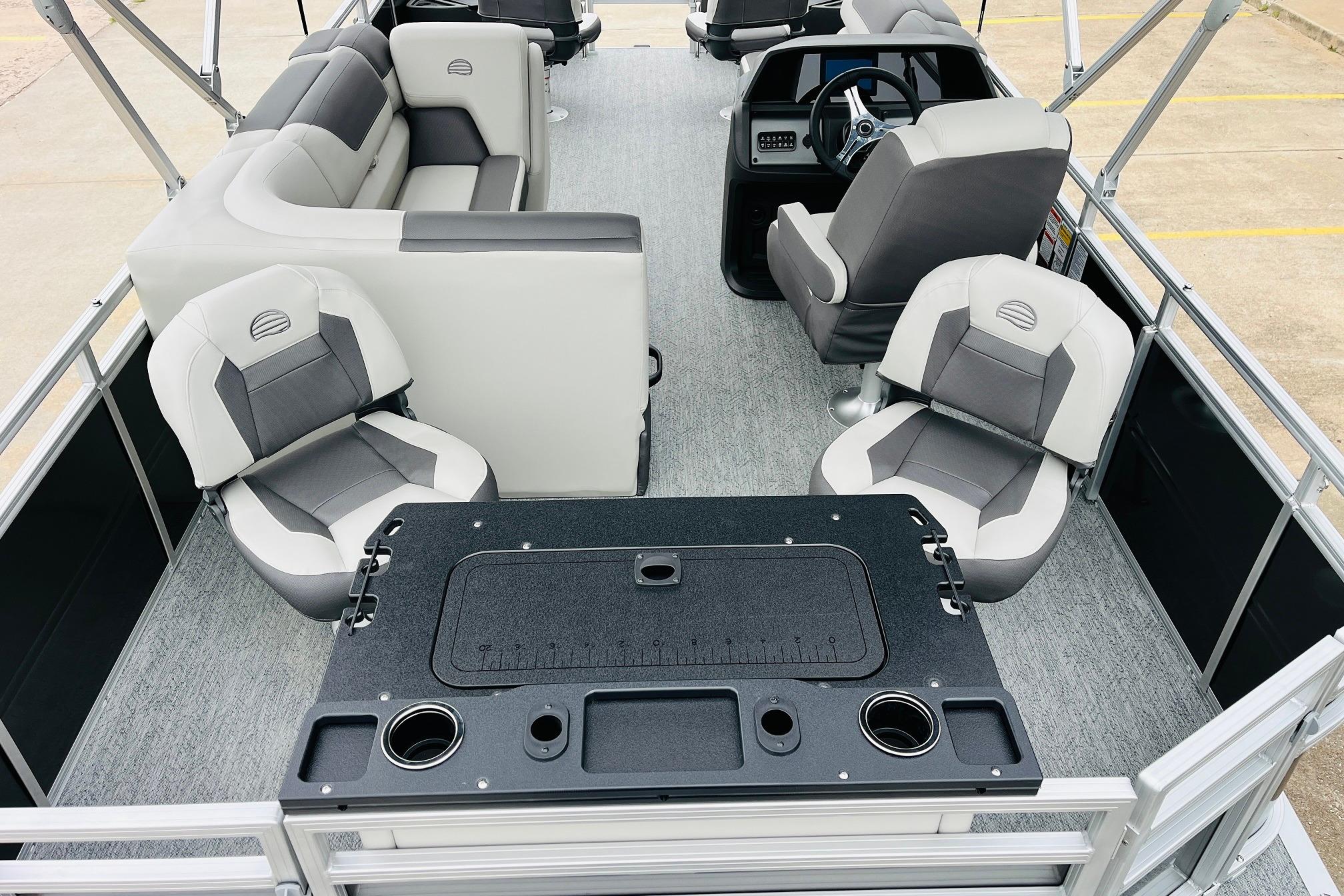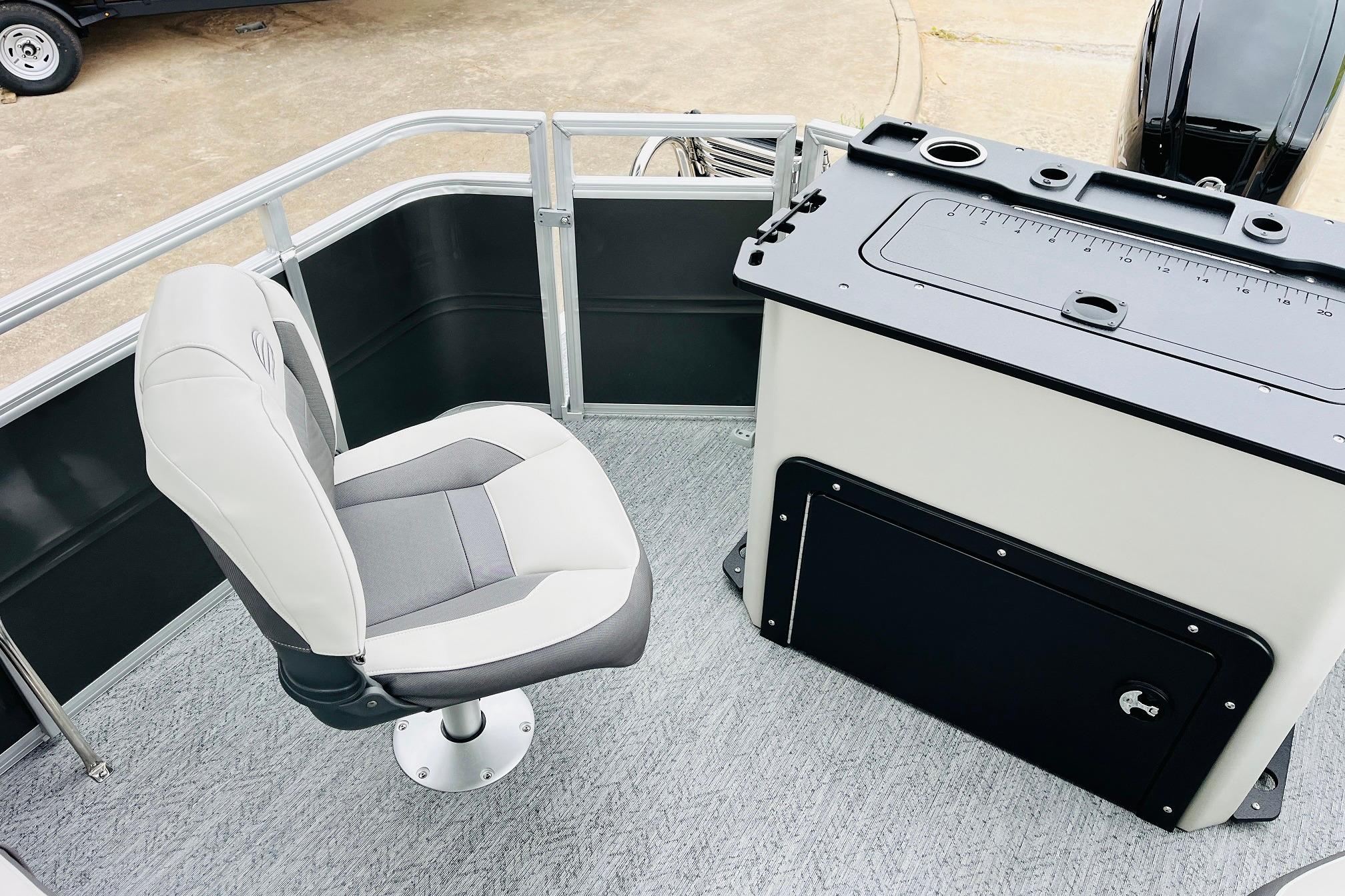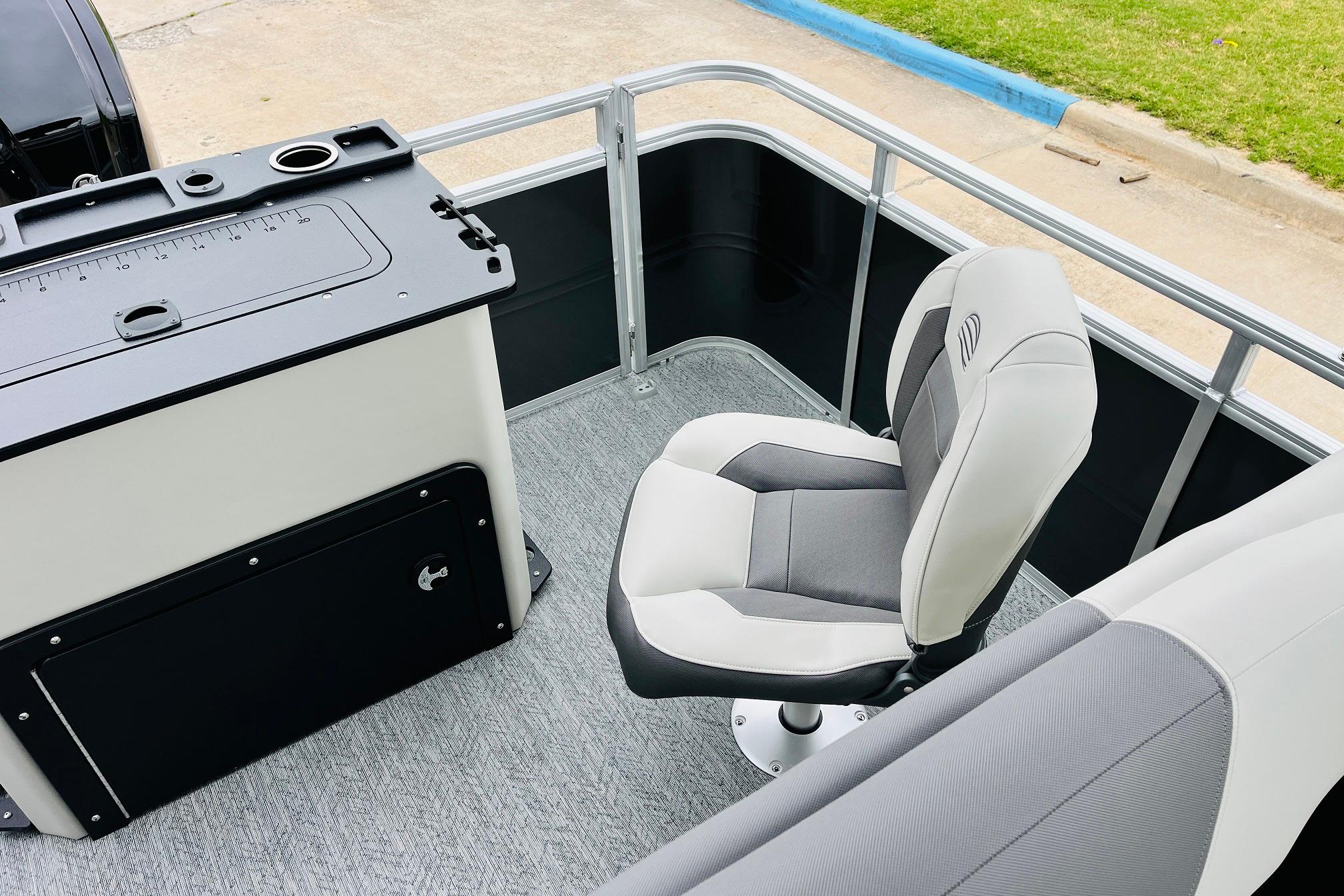 The 2026 FISHIN' BARGE 20 DLX takes fun seriously, and you will too when you're casting lines with the family from its 19' deck. Claim your favorite spot from either the fore or aft fishing decks, which boast 3 casting chairs, 2 aerated livewells, and rail-mounted holders ready to present your rods and tools. Those fishing chairs are removable and foldable to allow for deck customization. Both ends offer extra storage areas for tackle and tools.Those who are just along for the ride can relax in the 2 lounge seats with plenty of drink holders and a removable table. Those seats also boast the STOW MORE system, which secrets away storage areas under the seat cushions and seat backs. If the sun's beating down on you, put up the 9' QuickLift bimini top for some cool shade. Create a soundtrack for your trip with the standard Wet Sounds stereo with Bluetooth and 2 upholstery speakers. The wraparound fence and 3 inward swinging doors keep kids safe. The rear features a reboarding platform with a telescoping ladder with extra wide steps.