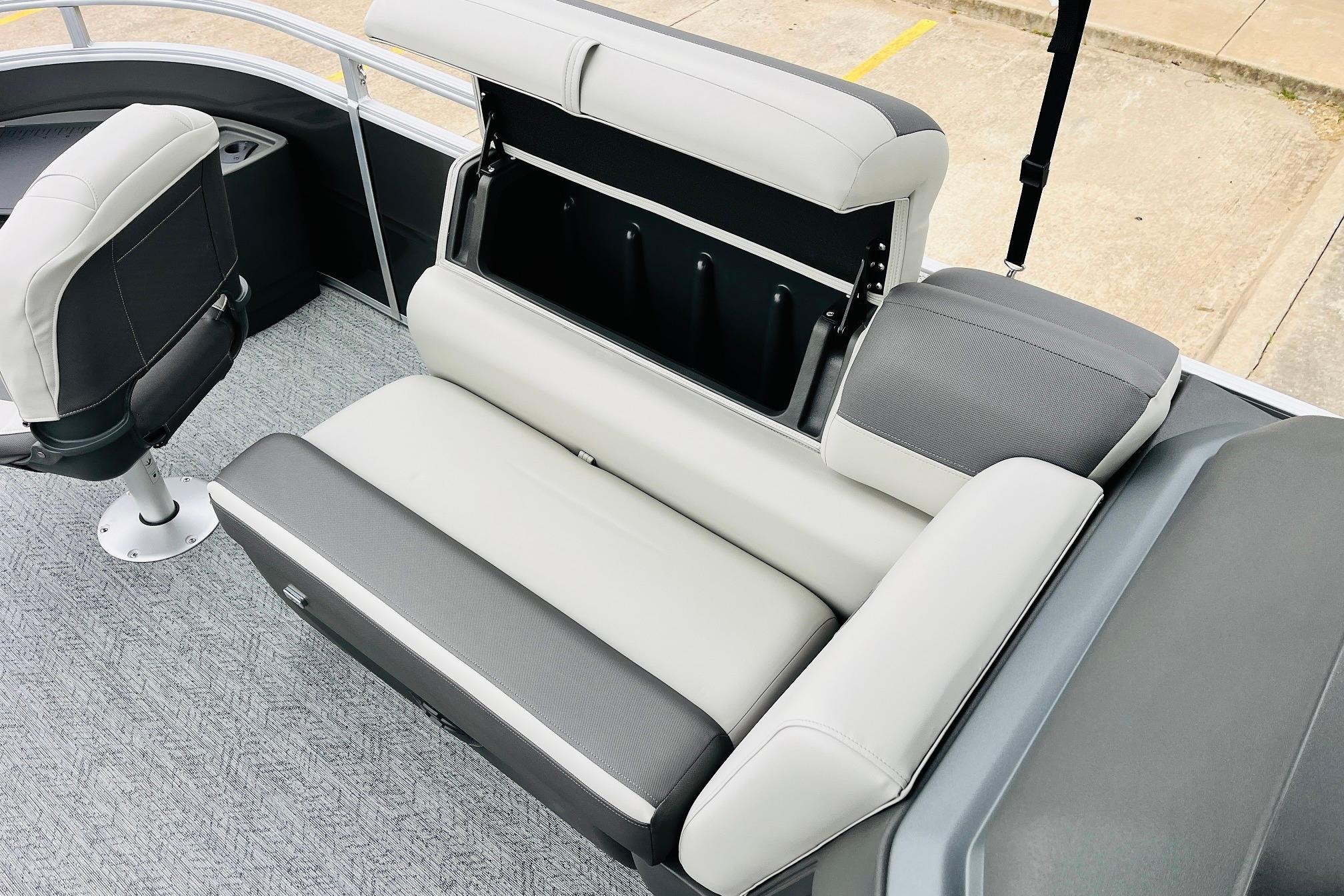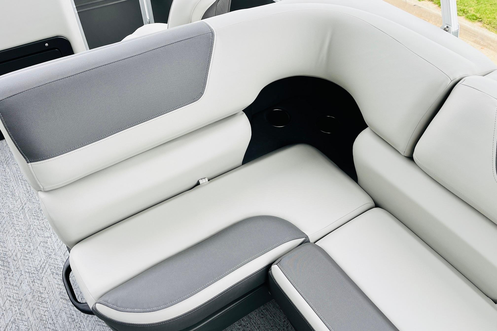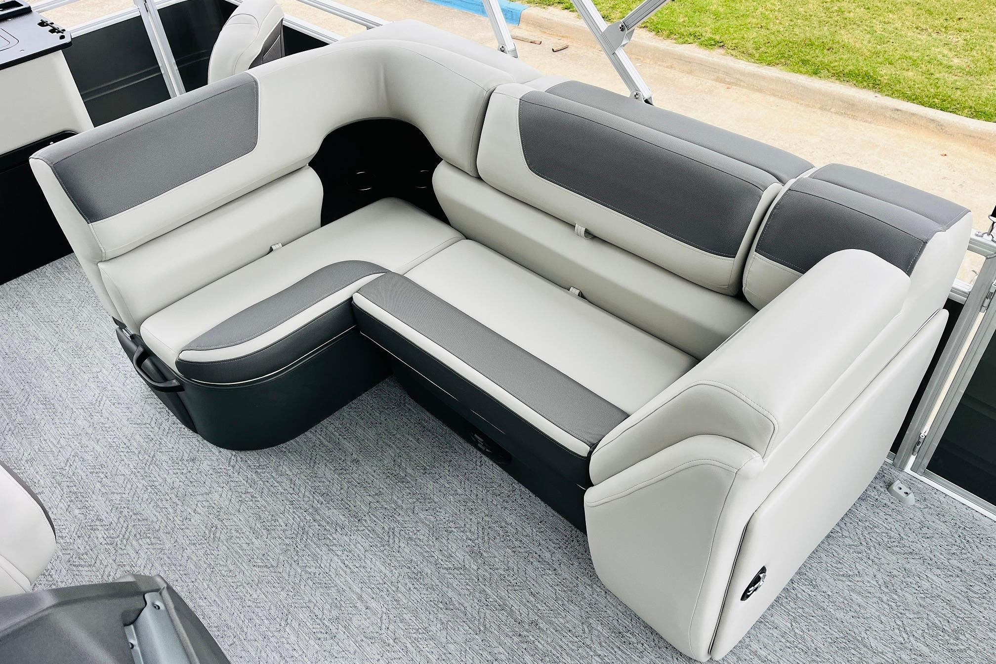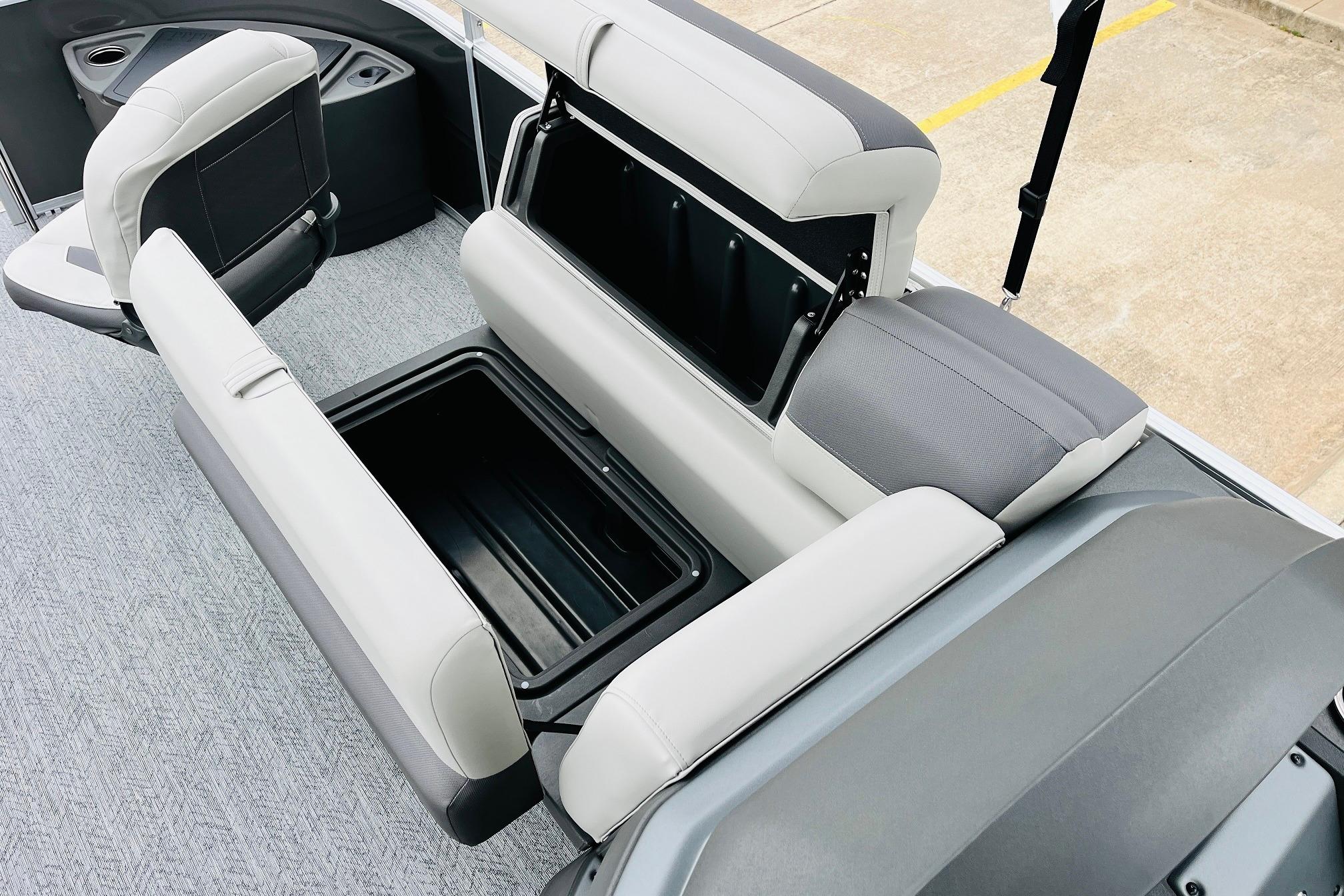 The 2026 FISHIN' BARGE 20 DLX takes fun seriously, and you will too when you're casting lines with the family from its 19' deck. Claim your favorite spot from either the fore or aft fishing decks, which boast 3 casting chairs, 2 aerated livewells, and rail-mounted holders ready to present your rods and tools. Those fishing chairs are removable and foldable to allow for deck customization. Both ends offer extra storage areas for tackle and tools.Those who are just along for the ride can relax in the 2 lounge seats with plenty of drink holders and a removable table. Those seats also boast the STOW MORE system, which secrets away storage areas under the seat cushions and seat backs. If the sun's beating down on you, put up the 9' QuickLift bimini top for some cool shade. Create a soundtrack for your trip with the standard Wet Sounds stereo with Bluetooth and 2 upholstery speakers. The wraparound fence and 3 inward swinging doors keep kids safe. The rear features a reboarding platform with a telescoping ladder with extra wide steps.