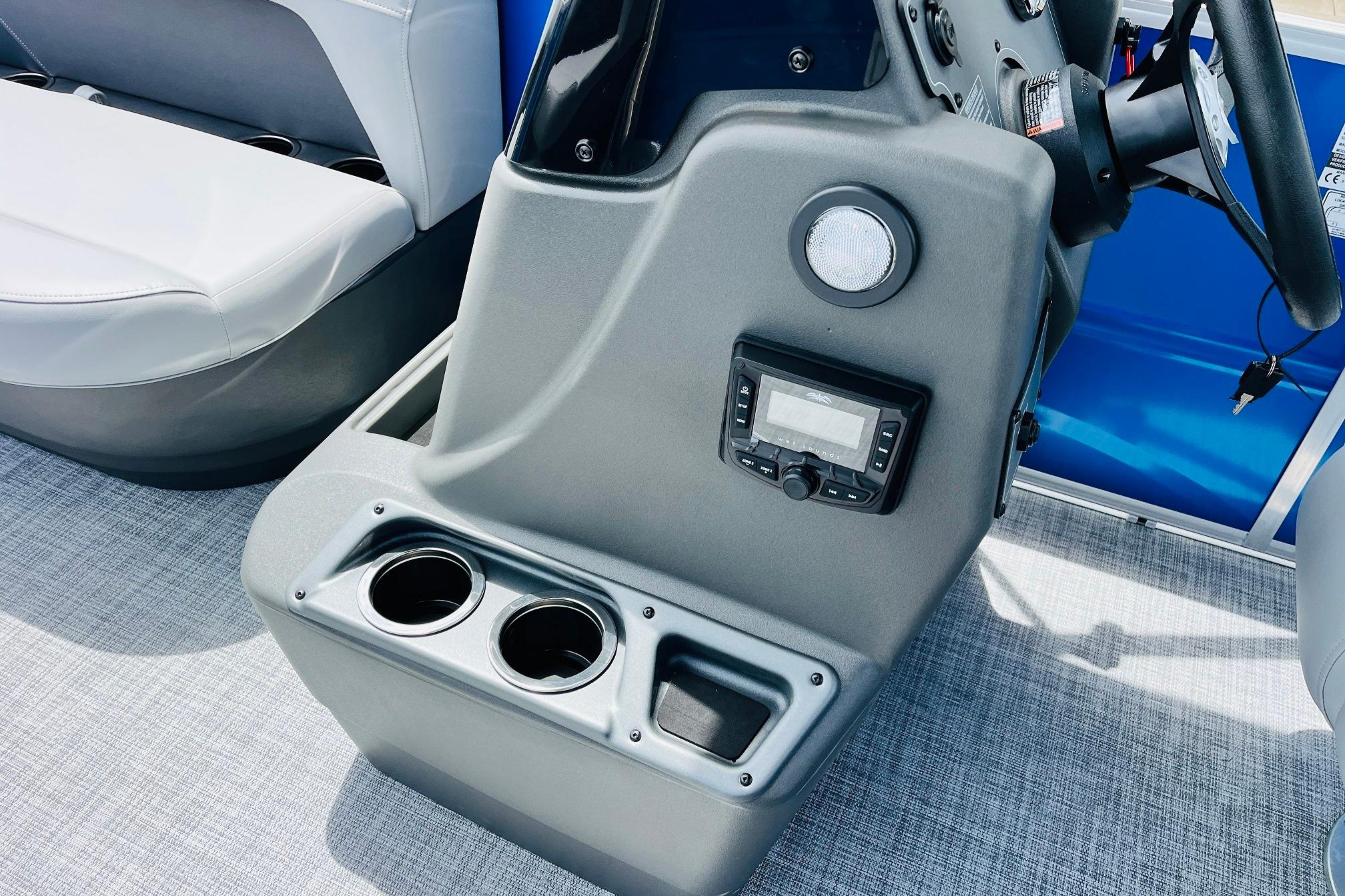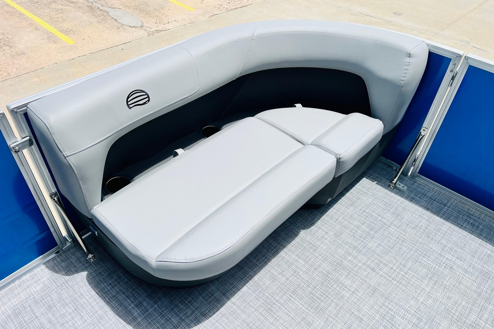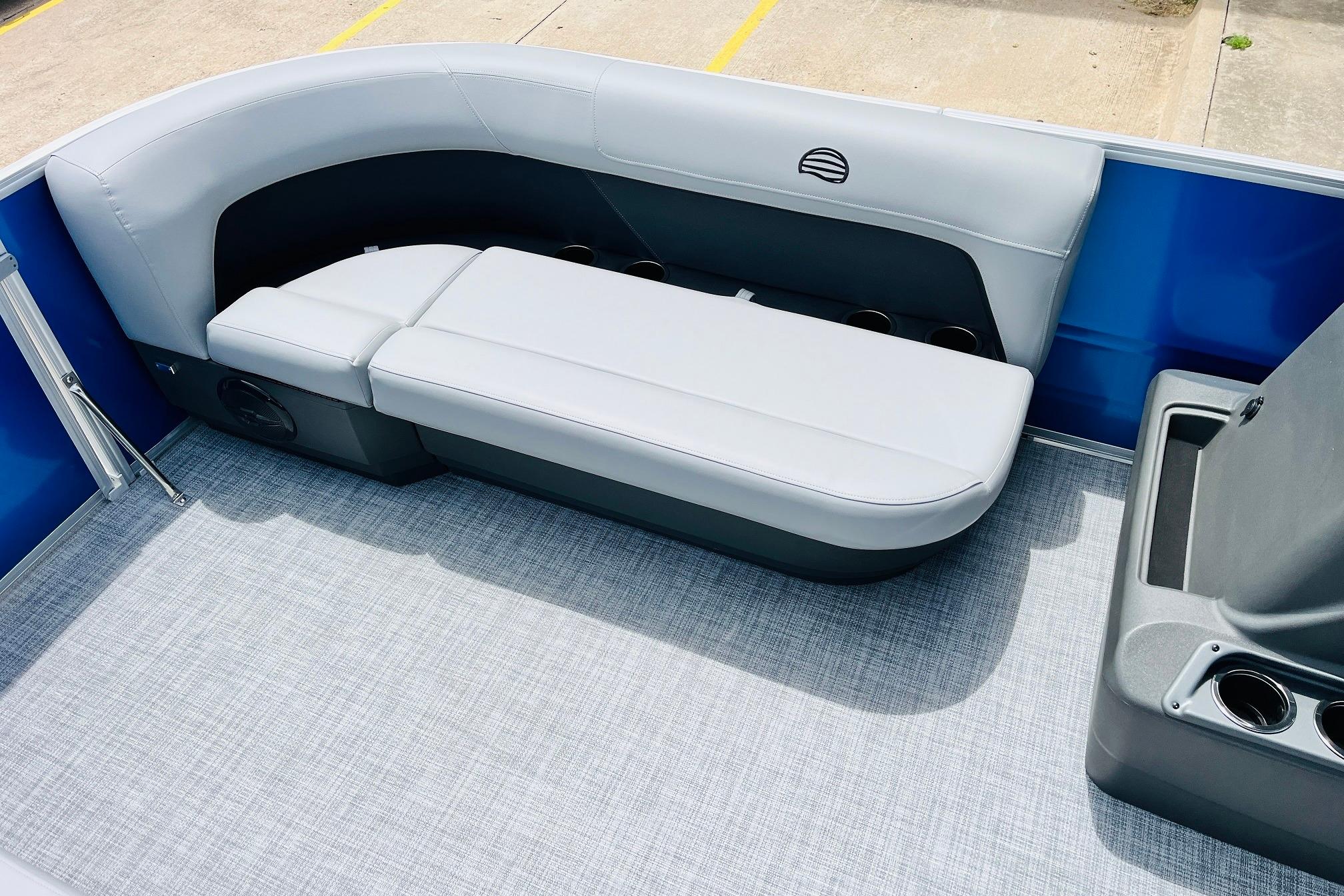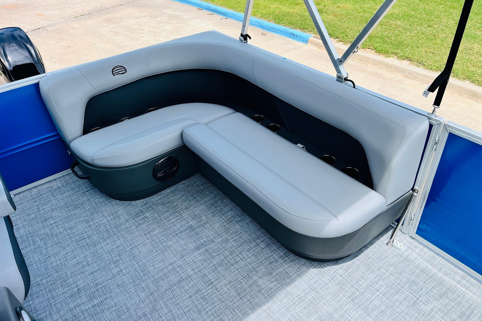 This year's PARTY BARGE gets some slick upgrades. Extra cupholders and storage built into the lounge backrests and improved handles make keeping your supplies at hand easier than ever. A new driver console design creates extra style. The boarding ladder has wider, more ergonomic steps. Crank up the soundtrack of the summer with the standard Bluetooth-capable Wet Sounds stereo and pull up the 7' bimini top to party in the shade when the sun is high. Find your corner of the lake and relax in one of the three corner lounges.Memories come easy in boats like the PARTY BARGE 16 DLX. Start making yours this summer!